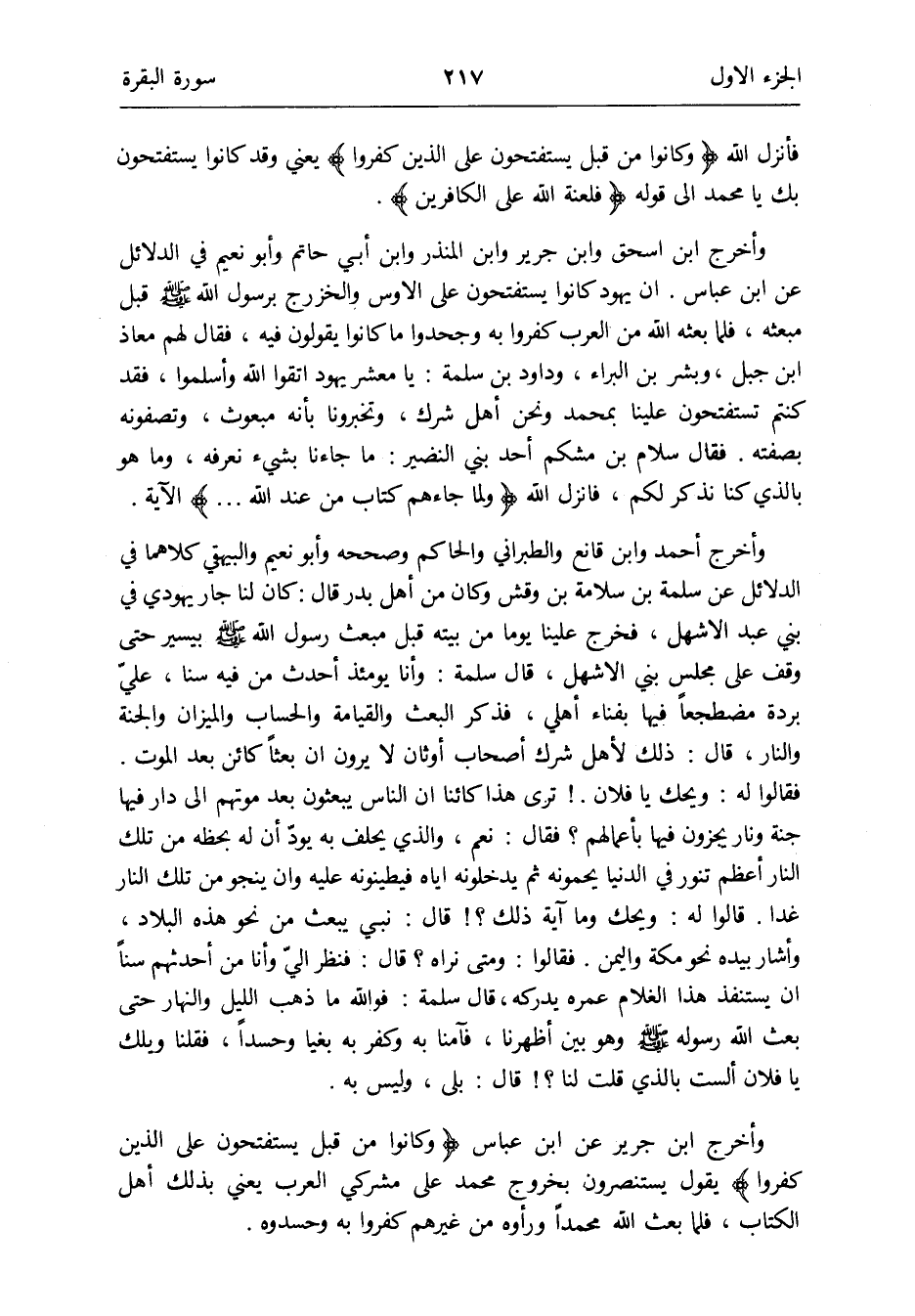 وَأخرج ابْن جرير عَن ابْن عَبَّاس {وَكَانُوا من قبل يستفتحون على الَّذين كفرُوا} يَقُول يستنصرون بِخُرُوج مُحَمَّد على مُشْركي الْعَرَب يَعْنِي بذلك أهل الْكتاب فَلَمَّا بعث الله مُحَمَّدًا ورأوه من غَيرهم كفرُوا بِهِ وحسدوه