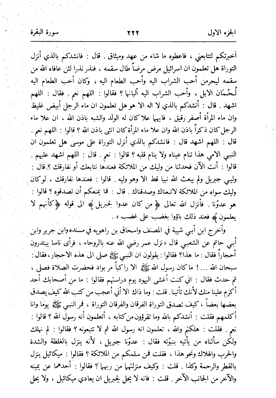 فَقلت: هلكتم وَالله تعلمُونَ أَنه رَسُول الله ثمَّ لَا تتبعونه فَقَالُوا: لم نهلك وَلَكِن سألناه من يَأْتِيهِ بنبوّته فَقَالَ: عدوّنا جِبْرِيل لِأَنَّهُ ينزل بالغلظة والشدة وَالْحَرب والهلاك وَنَحْو هَذَا فَقلت فَمن سلمكم من الْمَلَائِكَة فَقَالُوا: مِيكَائِيل ينزل بالقطر وَالرَّحْمَة وَكَذَا