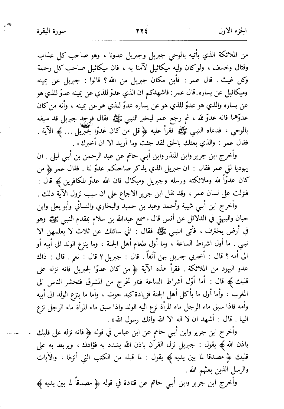 فَقَالَ عمر {من كَانَ عدوّاً لله وَمَلَائِكَته وَرُسُله وَجِبْرِيل وميكال فَإِن الله عدوّ للْكَافِرِينَ} قَالَ: فَنزلت على لِسَان عمر وَقد نقل ابْن جرير الاجماع على أَن سَبَب نزُول الْآيَة ذَلِك