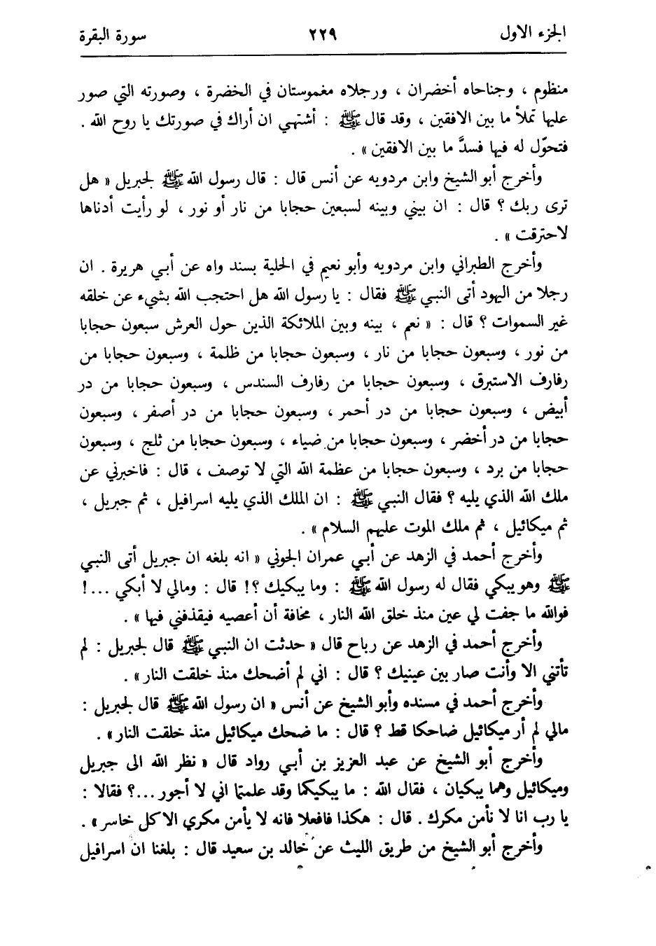 أنَّ رجلا من الْيَهُود أَتَى النَّبِي صلى الله عَلَيْهِ وَسلم فَقَالَ: يَا رَسُول الله هَل احتجب الله بِشَيْء عَن خلقه غير السَّمَوَات قَالَ: نعم بَينه وَبَين الْمَلَائِكَة الَّذين حول الْعَرْش سَبْعُونَ حِجَابا من نور وَسَبْعُونَ حِجَابا من نَار وَسَبْعُونَ حِجَابا من ظلمَة وَسَبْعُونَ حِجَابا من رفارف الاستبرق وَسَبْعُونَ حِجَابا من ظلمَة وَسَبْعُونَ حِجَابا من رفاف السندس وَسَبْعُونَ حِجَابا من در أَبيض وَسَبْعُونَ حِجَابا من در أَخْضَر وَسَبْعُونَ حِجَابا من در أَحْمَر وَسَبْعُونَ حِجَابا من در أصفر وَسَبْعُونَ حِجَابا من در أَخْضَر وَسَبْعُونَ حِجَابا من ضِيَاء وَسَبْعُونَ حِجَابا من ثلج وَسَبْعُونَ حِجَابا من برد وَسَبْعُونَ حِجَابا من عَظمَة الله الَّتِي لَا تُوصَف قَالَ: فَأَخْبرنِي عَن ملك الله الَّذِي يَلِيهِ فَقَالَ النَّبِي صلى الله عَلَيْهِ وَسلم: إِن الْملك الَّذِي يَلِيهِ إسْرَافيل ثمَّ جِبْرِيل ثمَّ مِيكَائِيل ثمَّ ملك الْمَوْت عَلَيْهِم السَّلَام