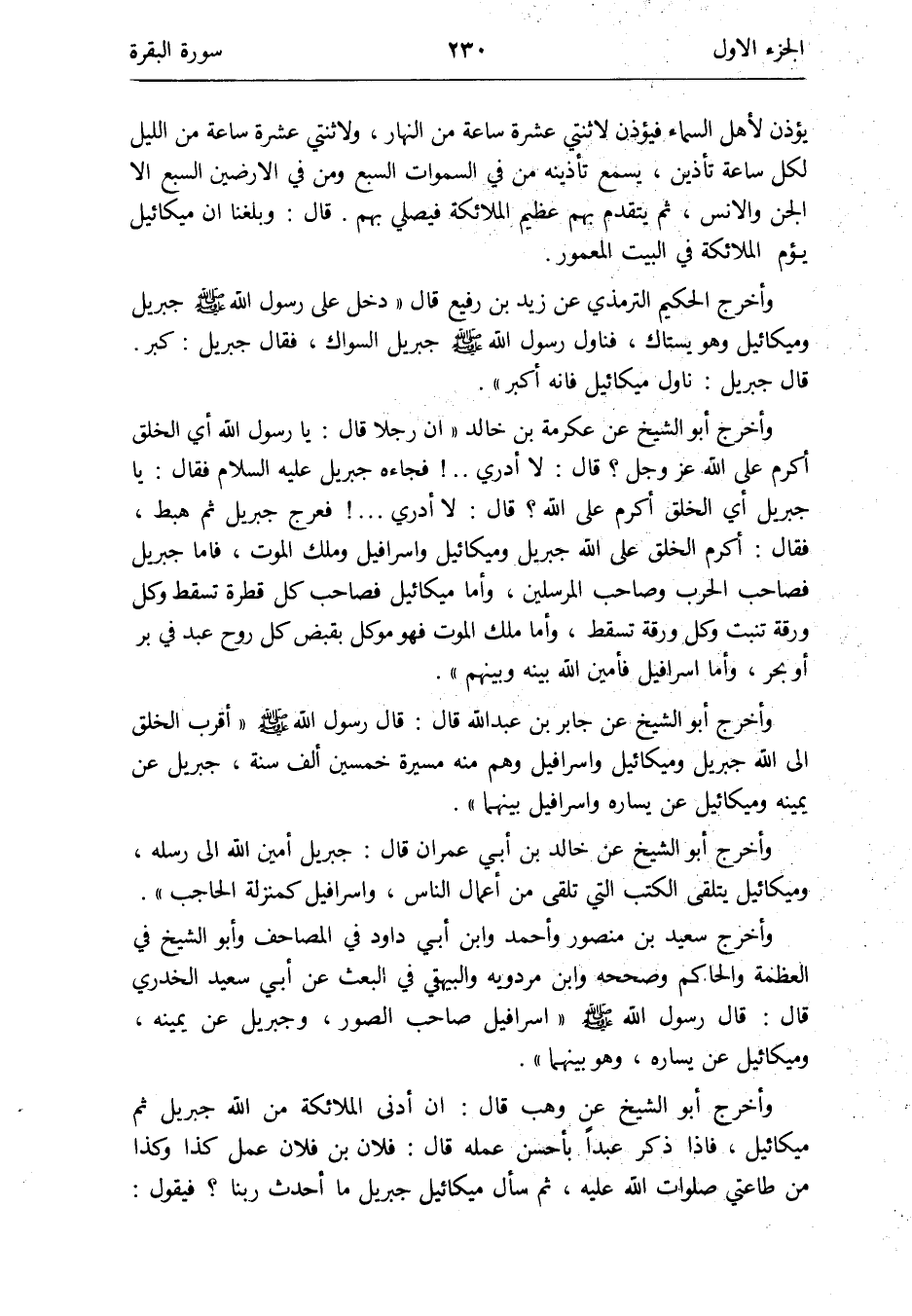 وَأخرج سعيد بن مَنْصُور وَأحمد وَابْن أبي دَاوُد فِي الْمَصَاحِف وَأَبُو الشَّيْخ فِي العظمة وَالْحَاكِم وَصَححهُ وَابْن مرْدَوَيْه وَالْبَيْهَقِيّ فِي الْبَعْث عَن أبي سعيد الْخُدْرِيّ قَالَ: قَالَ رَسُول الله صلى الله عَلَيْهِ وَسلم إسْرَافيل صَاحب الصُّور وَجِبْرِيل عَن يَمِينه وَمِيكَائِيل عَن يسَاره وَهُوَ بَينهمَا
