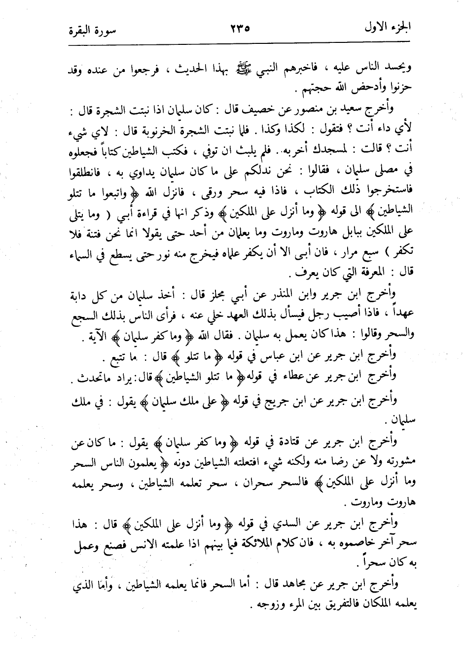 فَلم يلبث أَن توفّي فَكتب الشَّيَاطِين كتابا فجعلومه فِي مصلى سُلَيْمَان فَقَالُوا: نَحن ندلكم على مَا كَانَ سُلَيْمَان يداوي بِهِ فَانْطَلقُوا فَاسْتَخْرَجُوا ذَلِك الْكتاب فغذا فِيهِ سحر ورقى فَأنْزل الله {وَاتبعُوا مَا تتلوا الشَّيَاطِين} إِلَى قَوْله {وَمَا أنزل على الْملكَيْنِ} وَذكر أَنَّهَا فِي قِرَاءَة أبي (وَمَا يُتْلَى على الْملكَيْنِ بِبَابِل هاروت وماروت وَمَا يعلمَانِ من أحد حَتَّى يَقُولَا إِنَّمَا نَحن فتْنَة فَلَا تكفر) سبع مرار فَإِن أَبى إِلَّا أَن يكفر علماه فَيخرج مِنْهُ نور حَتَّى يسطع فِي السَّمَاء قَالَ: الْمعرفَة الَّتِي كَانَ يعرف
