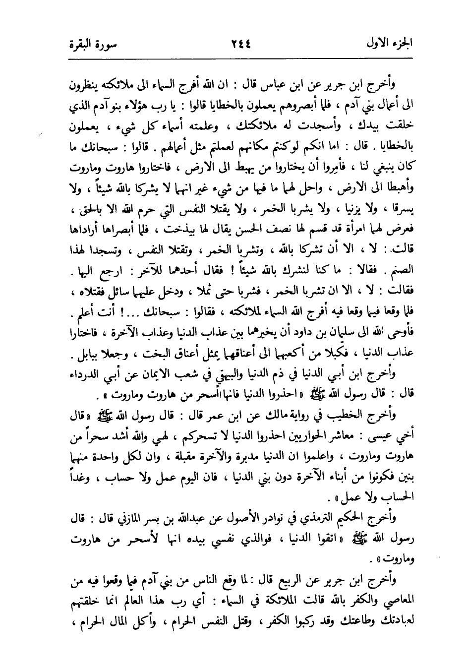 وَأخرج ابْن جرير عَن ابْن عَبَّاس قَالَ: إِن الله أفرج السَّمَاء إِلَى مَلَائكَته ينظرُونَ إِلَى أَعمال بني آدم فَلَمَّا أبصروهم يعْملُونَ بالخطايا قَالُوا: يَا رب هَؤُلَاءِ بَنو آدم الَّذِي خلقت بِيَدِك وأسجدت لَهُ ملائكتك وعلمته أَسمَاء كل شَيْء يعْملُونَ بالخطايا