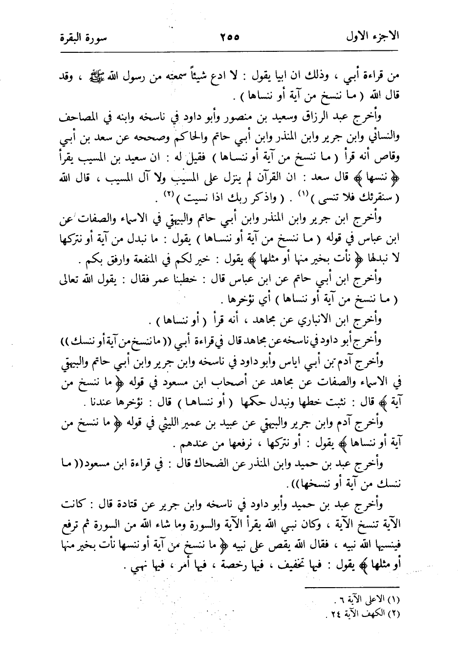 وَأخرج أَبُو دَاوُد فِي ناسخه عَن مُجَاهِد قَالَ فِي قِرَاءَة أبي ((ماننسخ من آيَة أَو ننسك)) وَأخرج آدم بن إِيَاس ولأبو دَاوُد فِي ناسخه وَابْن جرير وَابْن أبي حَاتِم وَالْبَيْهَقِيّ فِي الْأَسْمَاء وَالصِّفَات عَن مُجَاهِد عَن أَصْحَاب ابْن مَسْعُود فِي قَوْله {مَا ننسخ من آيَة} قَالَ: نثبت خطها ونبدل حكمهَا (أَو ننساها) قَالَ: نؤخرها عندنَا