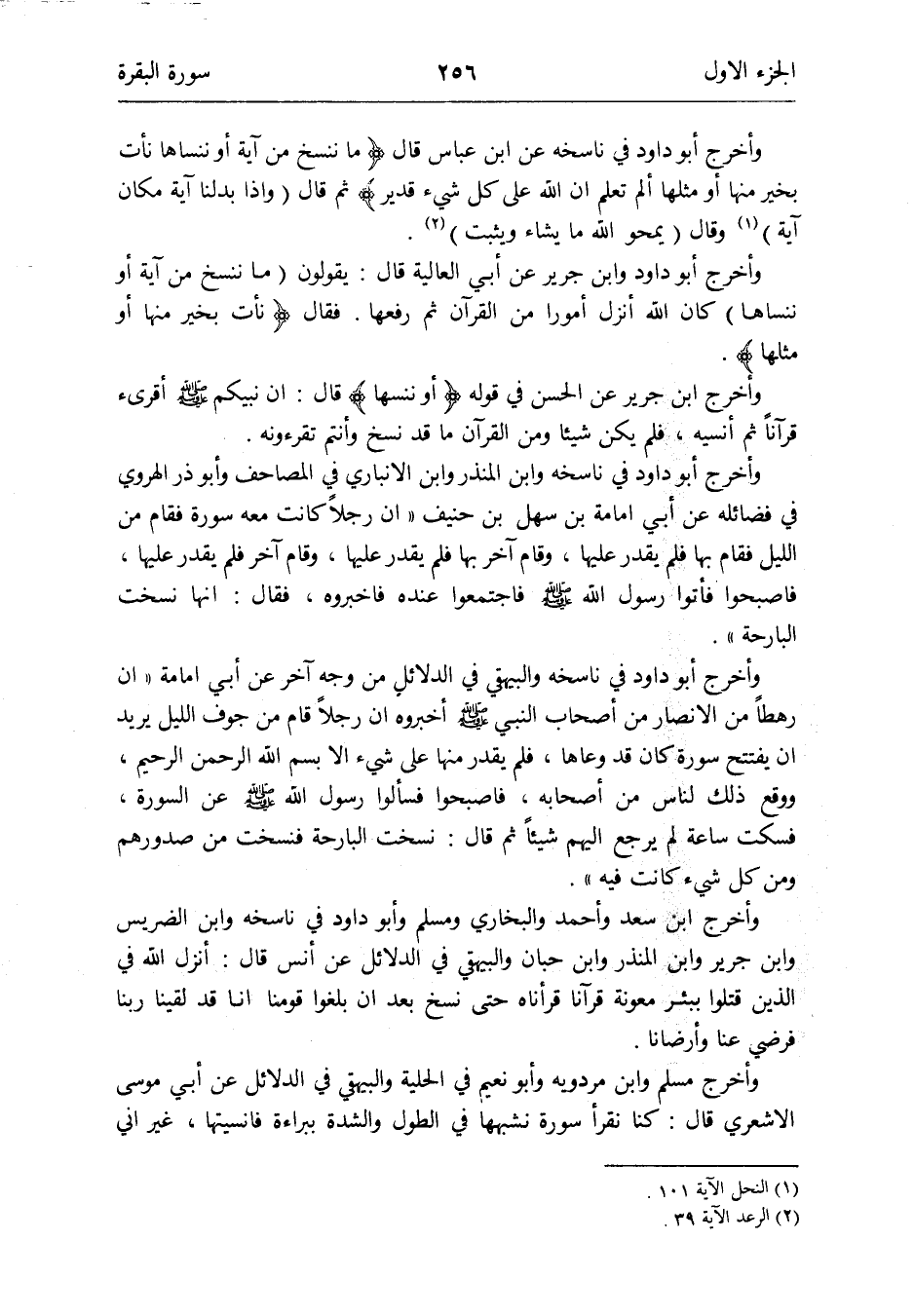 وَأخرج أَبُو دَاوُد فِي ناسخه عَن ابْن عَبَّاس قَالَ {مَا ننسخ من آيَة أَو ننسها نأت بِخَير مِنْهَا أَو مثلهَا ألم تعلم أَن الله على كل شَيْء قدير} ثمَّ قَالَ (وَإِذا بدلنا آيَة مَكَان آيَة) (النَّحْل الْآيَة 101) وَقَالَ (يمحو الله مَا يَشَاء وَيثبت) (الرَّعْد الْآيَة 39)