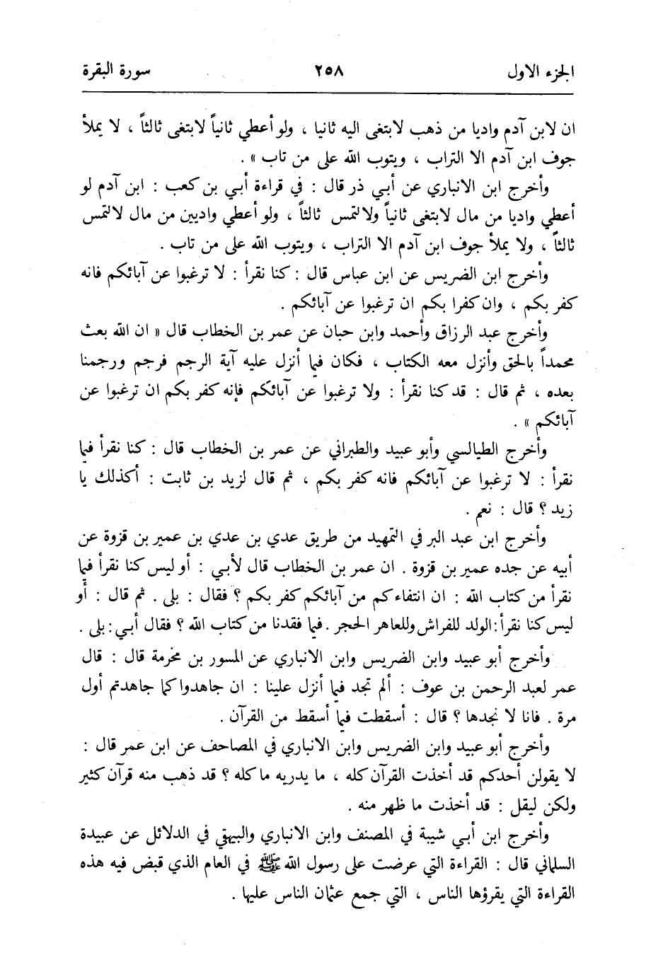 وَأخرج الطَّيَالِسِيّ وَأَبُو عبيد وَالطَّبَرَانِيّ عَن عمر بن الْخطاب قَالَ: كُنَّا نَقْرَأ فِيمَا نَقْرَأ: لَا ترغبوا عَن آبائكم فَإِنَّهُ كفر بكم ثمَّ قَالَ لزيد بن ثَابت: أَكَذَلِك يَا زيد قَالَ: نعم