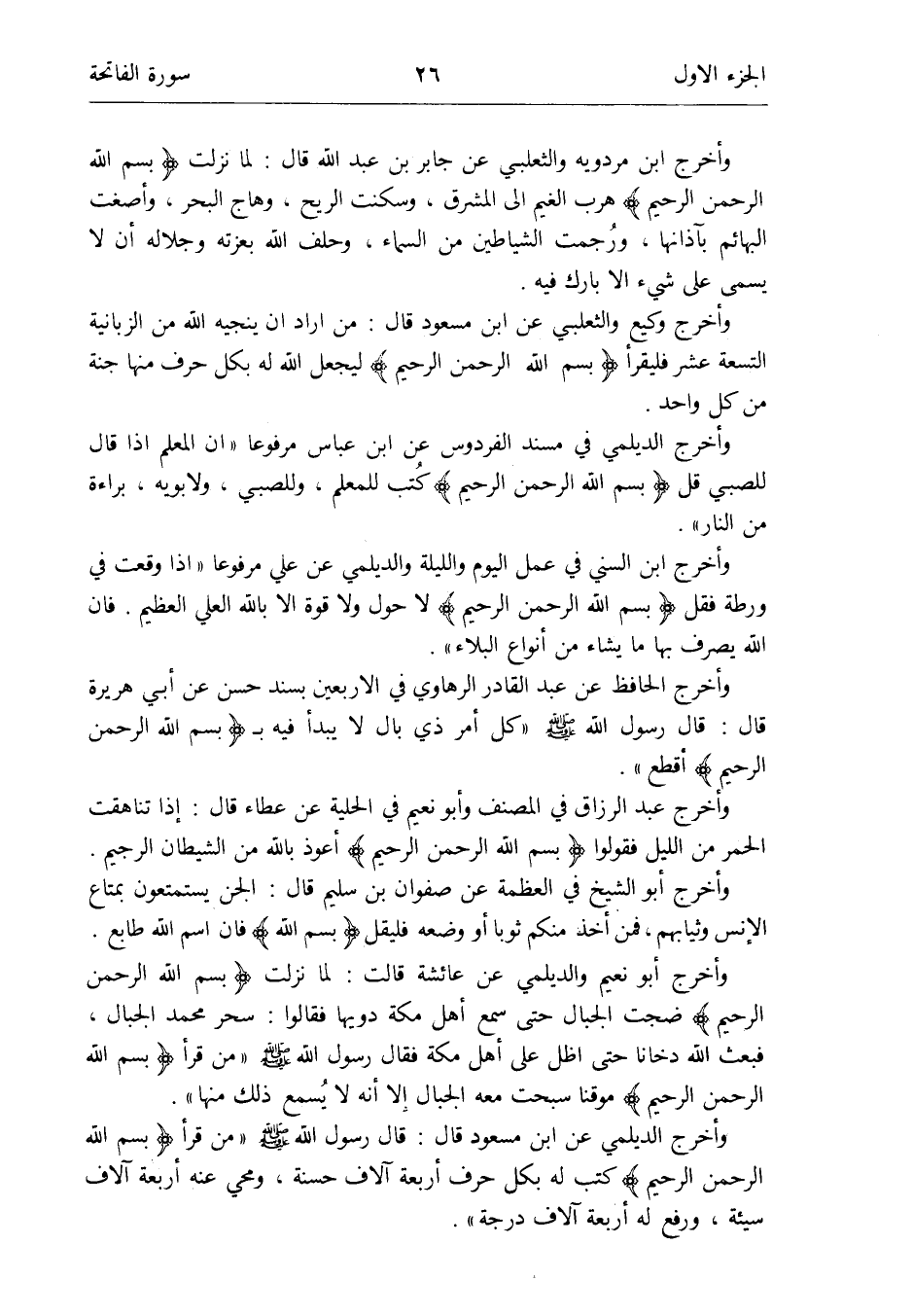 وَأخرج ابْن مرْدَوَيْه والثعلبي عَن جَابر بن عبد الله قَالَ: لما نزلت {بِسم الله الرَّحْمَن الرَّحِيم} هرب الْغَيْم إِلَى الْمشرق وسكنت الرّيح وهاج الْبَحْر وأصغت الْبَهَائِم بآذانها ورجمت الشَّيَاطِين من السَّمَاء وَحلف الله بعزته وجلاله أَن لَا يُسمى على شَيْء إِلَّا بَارك فِيهِ