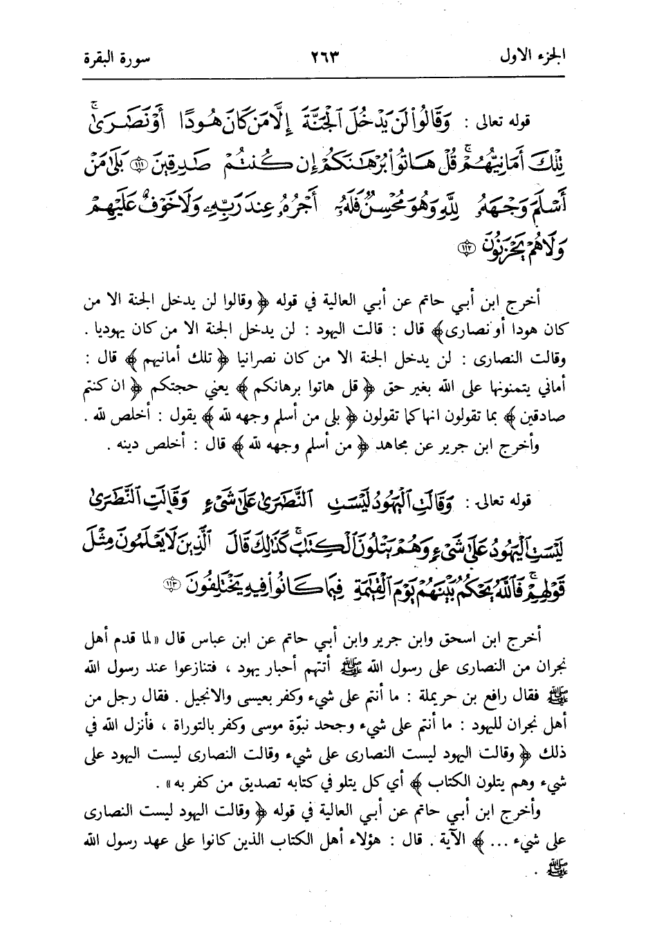 أخرج ابْن أبي حَاتِم عَن أبي الْعَالِيَة فِي قَوْله {وَقَالُوا لن يدْخل الْجنَّة إِلَّا من كَانَ هوداً أَو نَصَارَى} قَالَ: قَالَت الْيَهُود: لن يدْخل الْجنَّة إِلَّا من كَانَ يَهُودِيّا