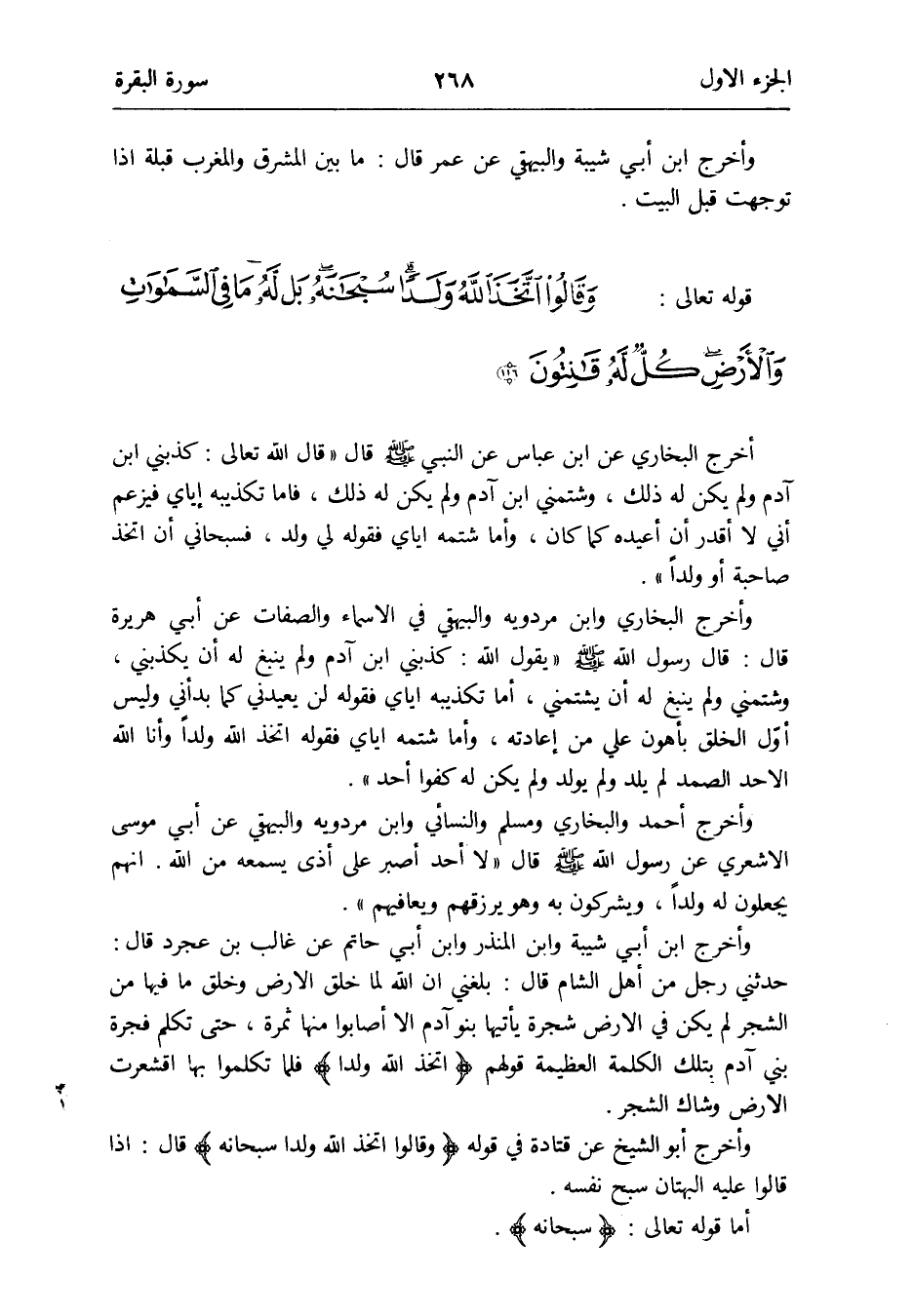 وَأخرج البُخَارِيّ وَابْن مرْدَوَيْه وَالْبَيْهَقِيّ فِي الْأَسْمَاء وَالصِّفَات عَن أبي هُرَيْرَة قَالَ: قَالَ رَسُول الله صلى الله عَلَيْهِ وَسلم يَقُول الله: كَذبَنِي ابْن آدم وَلم يَنْبغ لَهُ أَن يكذبنِي وَشَتَمَنِي ابْن آدم وَلم يَنْبغ لَهُ أَن يَشْتمنِي فإمَّا تَكْذِيبه إيَّايَ فَقَوله لن يُعِيدنِي كَمَا بَدَأَنِي وَلَيْسَ أوّل الْخلق بِأَهْوَن عَليّ من إِعَادَته وَأما شَتمه إيَّايَ فَقَوله اتخذ الله ولدا وَأَنا الله الْأَحَد الصَّمد لم يلد وَلم يُولد وَلم يكن لَهُ كفوا أحد