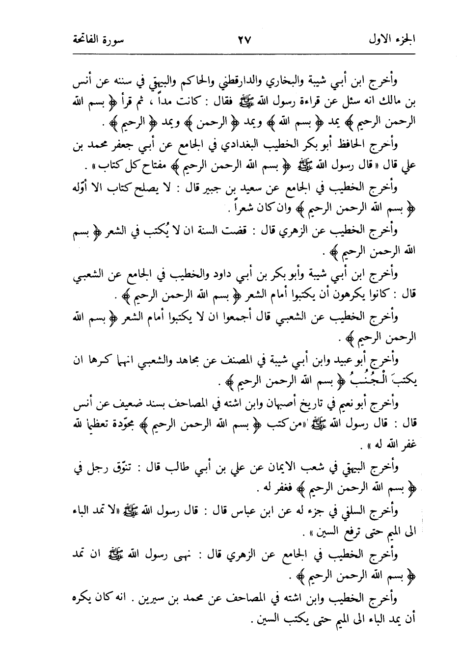 وَأخرج الْحَافِظ أَبُو بكر الْخَطِيب الْبَغْدَادِيّ فِي الْجَامِع عَن أبي جَعْفَر مُحَمَّد بن عَليّ قَالَ قَالَ رَسُول الله صلى الله عَلَيْهِ وَسلم {بِسم الله الرَّحْمَن الرَّحِيم} مِفْتَاح كل كتاب