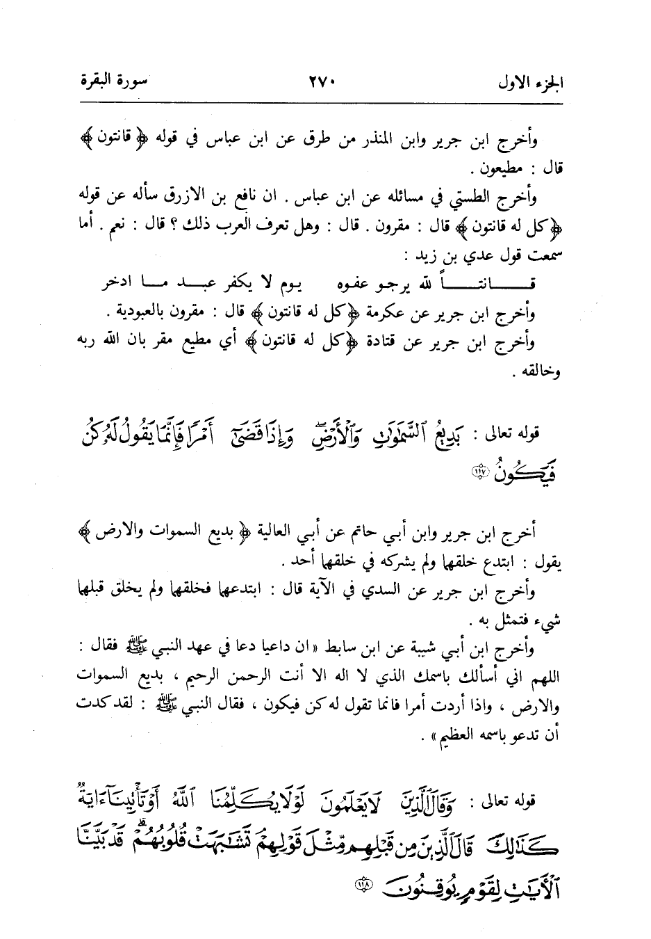 أما سَمِعت قَول عدي بن زيد: قَانِتًا لله يَرْجُو عَفوه يَوْم لَا يكفر عبد مَا ادخر وَأخرج ابْن جرير عَن عِكْرِمَة {كل لَهُ قانتون} قَالَ: مقرون بالعبودية