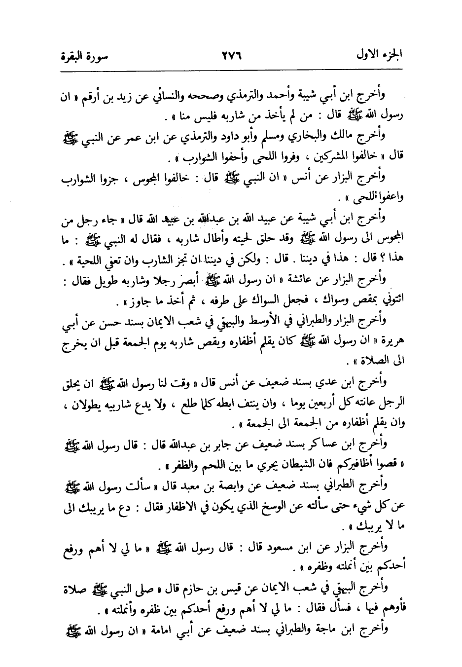 وَأخرج ابْن أبي شيبَة وَأحمد وَالتِّرْمِذِيّ وَصَححهُ وَالنَّسَائِيّ عَن زيد بن أَرقم أَن رَسُول الله صلى الله عَلَيْهِ وَسلم قَالَ: من لم يَأْخُذ من شَاربه فَلَيْسَ منا