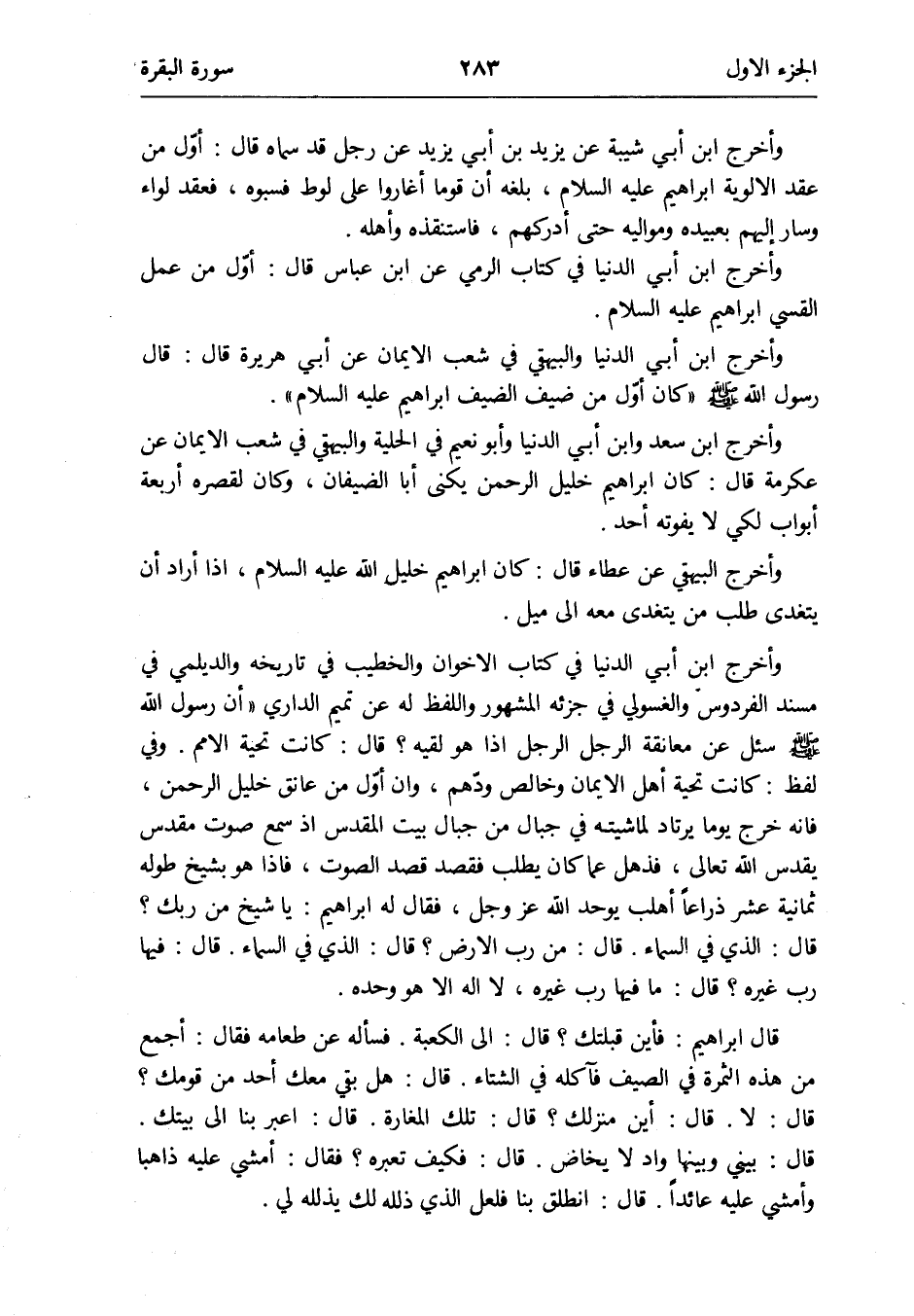 وَأخرج ابْن سعد وَابْن أبي الدُّنْيَا وَأَبُو نعيم فِي الْحِلْية وَالْبَيْهَقِيّ فِي شعب الإِيمان عَن عِكْرِمَة قَالَ: كَانَ إِبْرَاهِيم خَلِيل الرَّحْمَن يكنى أَبَا الضيفان وَكَانَ لقصره أَرْبَعَة أَبْوَاب لكَي لَا يفوتهُ أحد