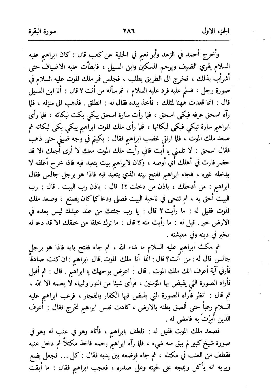 وَأخرج أَحْمد فِي الزّهْد وَأَبُو نعيم فِي الْحِلْية عَن كَعْب قَالَ: كَانَ إِبْرَاهِيم عَلَيْهِ السَّلَام يقري الضَّيْف وَيرْحَم الْمِسْكِين وَابْن السَّبِيل فابطأت عَلَيْهِ الأضياف حَتَّى أشرأب بذلك فَخرج إِلَى الطَّرِيق يطْلب فَجَلَسَ ملك الْمَوْت عَلَيْهِ السَّلَام فِي صُورَة رجل فَسلم عَلَيْهِ فَرد السَّلَام ثمَّ سَأَلَهُ من أَنْت قَالَ: أَنا ابْن السَّبِيل قَالَ: إِنَّمَا قعدت هَهُنَا لمثلك فَأخذ بِيَدِهِ فَقَالَ لَهُ: انْطلق