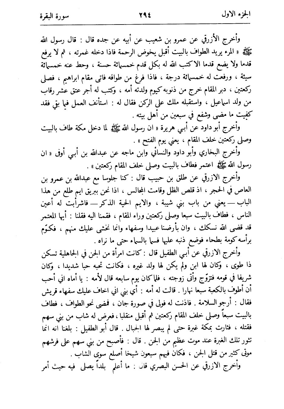 وَأخرج الْأَزْرَقِيّ عَن عَمْرو بن شُعَيْب عَن أَبِيه عَن جده قَالَ: قَالَ رَسُول الله صلى الله عَلَيْهِ وَسلم الْمَرْء يُرِيد الطّواف بِالْبَيْتِ أقبل يَخُوض الرَّحْمَة فَإِذا دَخلته غمرته ثمَّ لَا يرفع قدماً وَلَا يضع قدماً إِلَّا كتب الله لَهُ بِكُل قدم خَمْسمِائَة حَسَنَة وَحط عَنهُ خَمْسمِائَة سَيِّئَة وَرفعت لَهُ خَمْسمِائَة دَرَجَة فَإِذا فرغ من طَوَافه فَأتى مقَام إِبْرَاهِيم فصلى رَكْعَتَيْنِ دبر الْمقَام خرج من ذنُوبه كَيَوْم وَلدته أمه وَكتب لَهُ أحر عتق عشر رِقَاب من ولد إِسْمَاعِيل واستقبله ملك على الرُّكْن فَقَالَ لَهُ: اسْتَأْنف الْعَمَل فِيمَا بَقِي فقد كفيت مَا مضى وشفع فِي سبعين من أهل بَيته