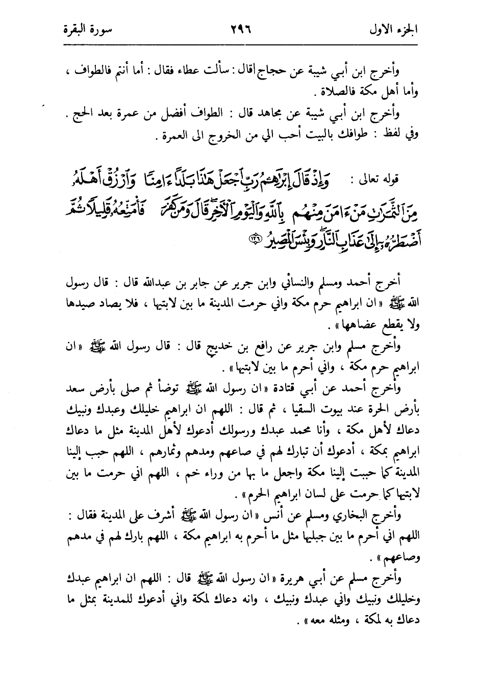وَأخرج مُسلم وَابْن جرير عَن رَافع بن خديج قَالَ: قَالَ رَسُول الله صلى الله عَلَيْهِ وَسلم إِن إِبْرَاهِيم حرم مَكَّة وَإِنِّي أحرم مَا بَين لابتيها