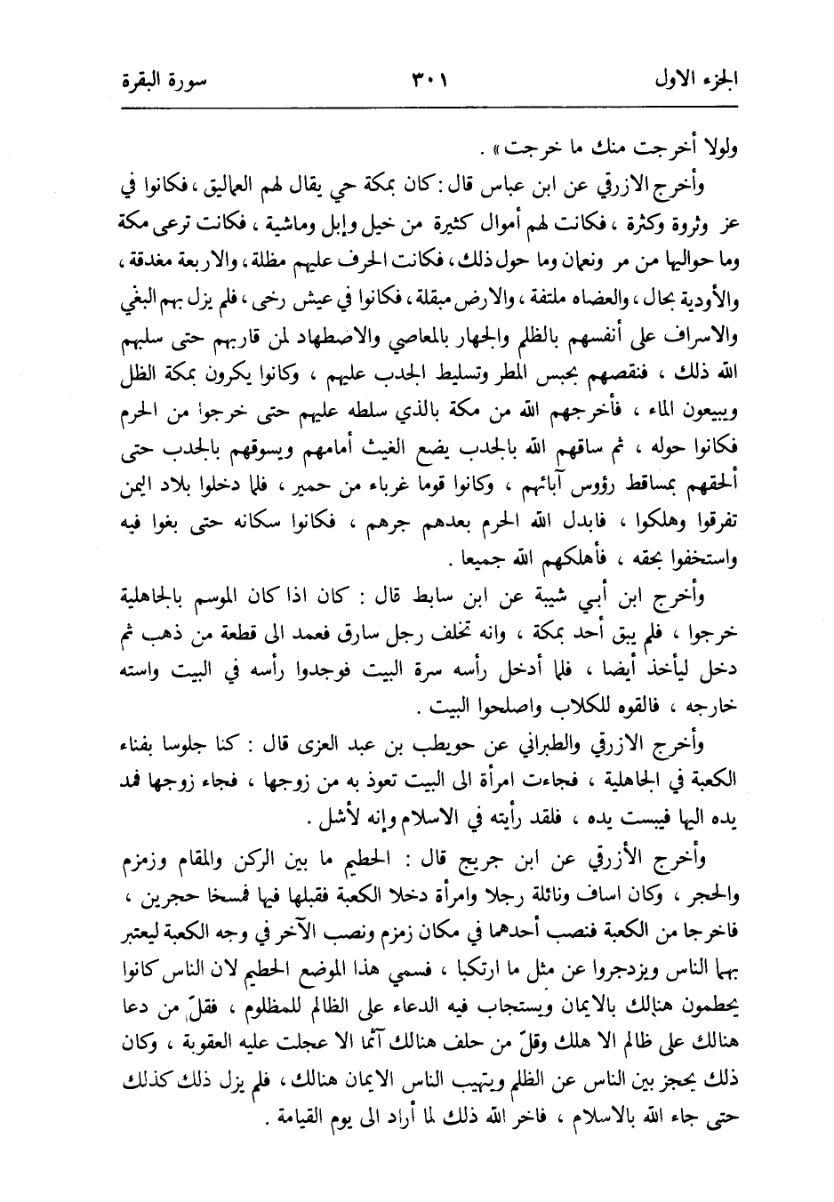 وَأخرج الْأَزْرَقِيّ عَن ابْن عَبَّاس قَالَ: كَانَ بِمَكَّة حَيّ يُقَال لَهُم العماليق فكلنوا فِي عز وثروة وَكَثْرَة فَكَانَت أَمْوَالهم كَثِيرَة من خيل وإبل وماشية فَكَانَت ترعى مَكَّة وَمَا حواليها من مر ونعمان وَمَا حول ذَلِك فَكَانَت الْحَرْف عَلَيْهِم مظلة وَالْأَرْبَعَة مغدقة والأودية بِحَال والغضاه ملتفة وَالْأَرْض مبقلة فَكَانُوا فِي عَيْش رخى فَلم يزل بهم الْبَغي والإِسراف على أنفسهم بالظلم والجهار بِالْمَعَاصِي والاضطهاد لمن قاربهم حَتَّى سلبهم الله ذَلِك فنقصهم بِحَبْس الْمَطَر وتسليط الجدب عَلَيْهِم وَكَانُوا يكرون بِمَكَّة الظل ويبيعون المَاء فَأخْرجهُمْ الله من مَكَّة بِالَّذِي سلطه عَلَيْهِم حَتَّى خَرجُوا من الْحرم فَكَانُوا حوله ثمَّ ساقهم الله بالجدب يضع الْغَيْث أمامهم ويسوقهم بالجدب حَتَّى ألحقهم بمساقط رُؤُوس آبَائِهِم وَكَانُوا قوما غرباء من حمير فَلَمَّا دخلُوا بِلَاد الْيمن تفَرقُوا وهلكوا فأبدل الله الْحرم بعدهمْ جرهم فَكَانُوا سكانه حَتَّى بغوا فِيهِ واستخفوا بِحقِّهِ فأهلكهم الله جَمِيعًا
