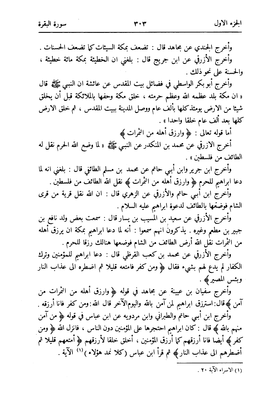 وَأخرج ابْن أبي حَاتِم وَالطَّبَرَانِيّ وَابْن مرْدَوَيْه عَن ابْن عَبَّاس فِي قَوْله {من آمن مِنْهُم بِاللَّه} قَالَ: كَانَ إِبْرَاهِيم احتجرها على الْمُؤمنِينَ دون النَّاس فَأنْزل فِي قَوْله {وَمن كفر} أَيْضا فَأَنا أرزقهم كَمَا أرزق الْمُؤمنِينَ أخلق خلقا لأرزقهم {فأمتعه قَلِيلا ثمَّ أضطره إِلَى عَذَاب النَّار} ثمَّ قَرَأَ ابْن عَبَّاس (كلاًّ نمد هَؤُلَاءِ) (الإِسراء الْآيَة 20) الْآيَة