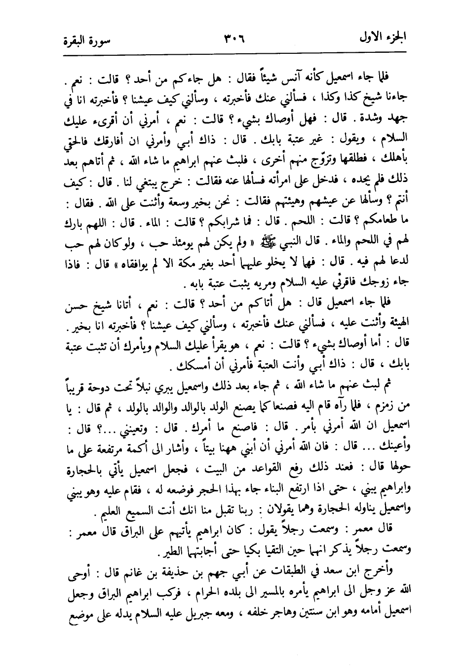 وَأخرج ابْن سعد فِي الطَّبَقَات عَن أبي جهم بن حُذَيْفَة بن غَانِم قَالَ: أوحى الله عز وَجل إِلَى إِبْرَاهِيم يَأْمُرهُ بِالْمَسِيرِ إِلَى بَلَده الْحَرَام فَركب إِبْرَاهِيم الْبراق وَجعل اسماعيل أَمَامه وَهُوَ ابْن سِتِّينَ وَهَاجَر خَلفه وَمَعَهُ جِبْرِيل عَلَيْهِ السَّلَام يدله على مَوضِع