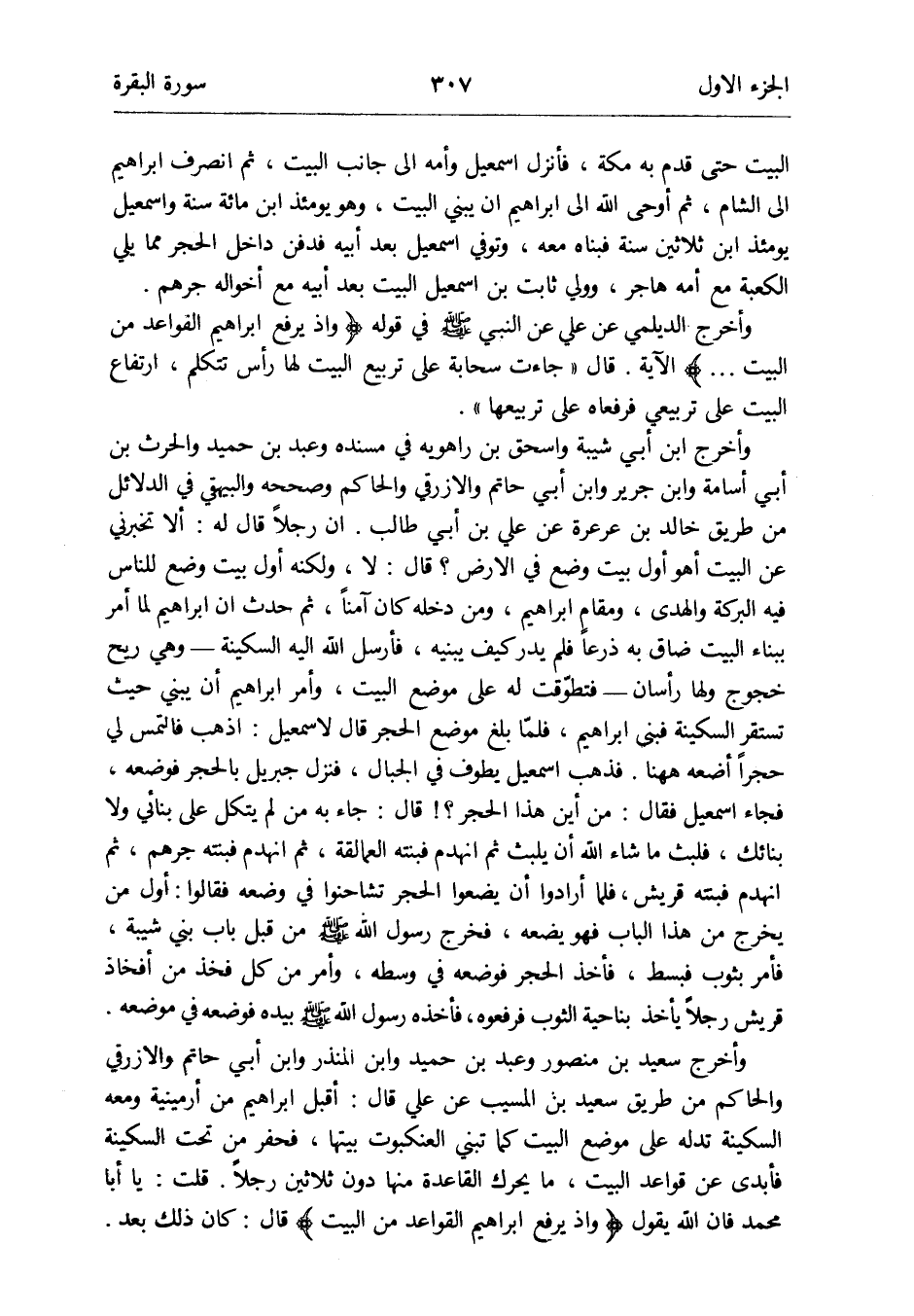 وَأخرج سعيد بن مَنْصُور وَعبد بن حميد وَابْن الْمُنْذر وَابْن أبي حَاتِم والأزرقي وَالْحَاكِم من طَرِيق سعيد بن الْمسيب عَن عَليّ قَالَ: أقبل إِبْرَاهِيم على أرمينية وَمَعَهُ السكينَة تدله على مَوضِع الْبَيْت كَمَا تبني العنكبوت بَيتهَا فحفر من تَحت السكينَة فأبدى عَن قَوَاعِد الْبَيْت مَا يُحَرك الْقَاعِدَة مِنْهَا دون ثَلَاثِينَ رجلا