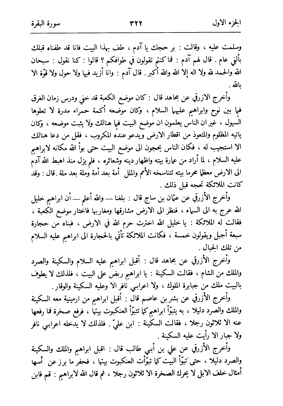 وَأخرج الْأَزْرَقِيّ عَن بشر بن عَاصِم قَالَ: أقبل إِبْرَاهِيم من أرمينية مَعَه السكينَة وَالْملك والصرد دَلِيلا بِهِ يتبوّأ إِبْرَاهِيم كَمَا تتبوّأ العنكبوت بَيتهَا فَرفع صَخْرَة فَمَا رَفعهَا عَنهُ إِلَّا ثَلَاثُونَ رجلا فَقَالَت السكينَة: ابْن عليّ