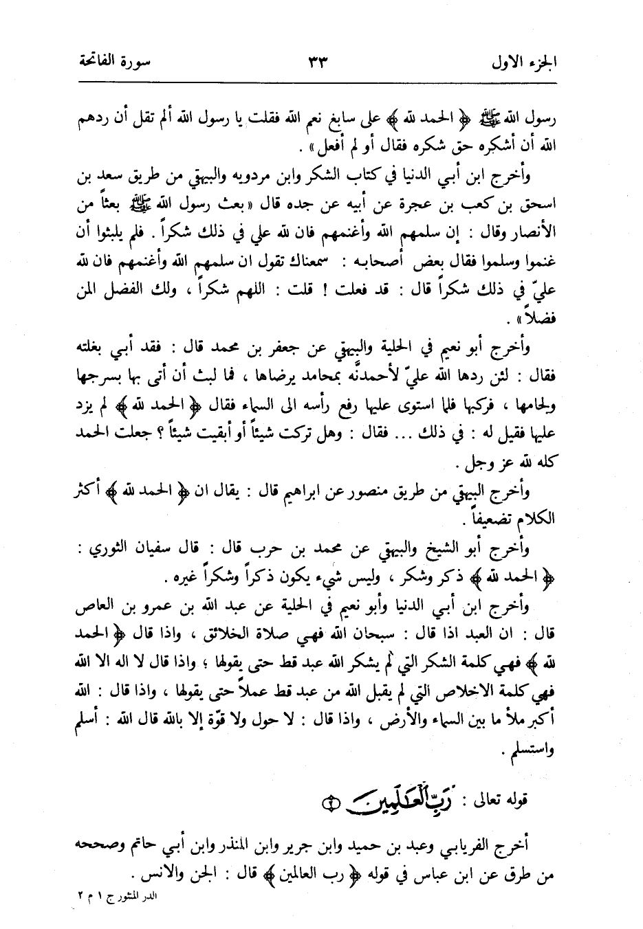 وَأخرج أَبُو الشَّيْخ وَالْبَيْهَقِيّ عَن مُحَمَّد بن حَرْب قَالَ: قَالَ سُفْيَان الثَّوْريّ: {الْحَمد لله} ذكر وشكر وَلَيْسَ شَيْء يكون ذكرا وشكراً غَيره