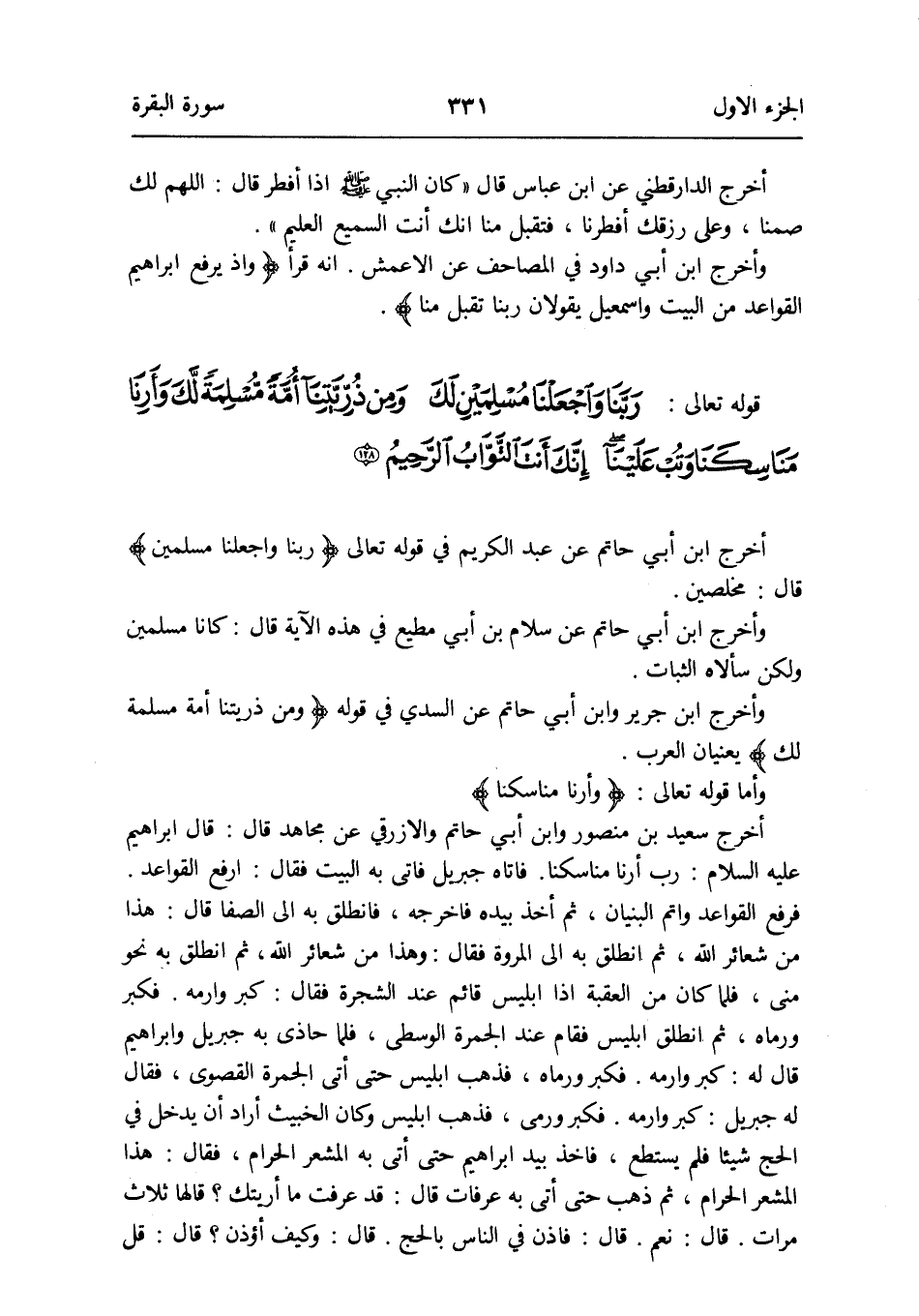 وَأما قَوْله تَعَالَى: {وأرنا مناسكنا} أخرج سعيد بن مَنْصُور وَابْن أبي حَاتِم والأزرقي عَن مُجَاهِد قَالَ: قَالَ إِبْرَاهِيم عَلَيْهِ السَّلَام: رب أرنا مناسكنا