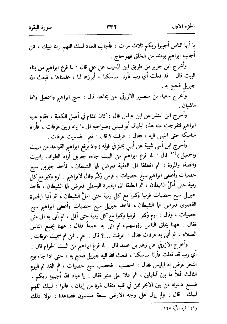 وَأخرج ابْن جرير من طَرِيق ابْن الْمسيب عَن عَليّ قَالَ: لما فرغ إِبْرَاهِيم من بِنَاء الْبَيْت قَالَ: قد فعلت أَي رب فأرنا مناسكنا أبرزها لنا علمناها فَبعث الله جِبْرِيل فحج بِهِ