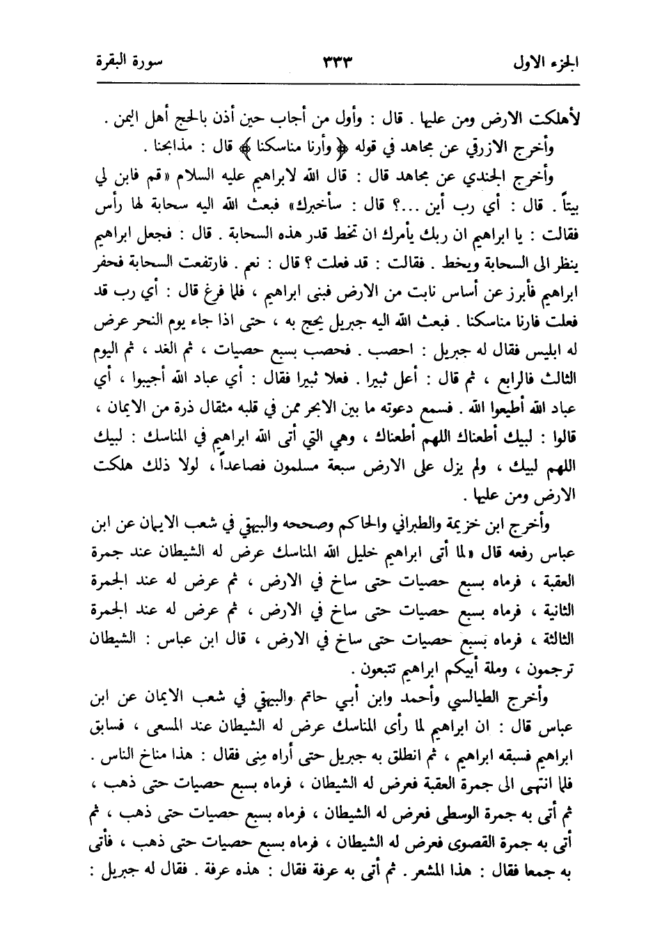وَأخرج ابْن خُزَيْمَة وَالطَّبَرَانِيّ وَصَححهُ وَالْبَيْهَقِيّ فِي شعب الإِيمان عَن ابْن عَبَّاس رَفعه قَالَ لما أَتَى إِبْرَاهِيم خَلِيل الله الْمَنَاسِك عرض لَهُ الشَّيْطَان عِنْد جَمْرَة الْعقبَة فَرَمَاهُ بِسبع حَصَيَات حَتَّى ساخ فِي الأَرْض ثمَّ عرض لَهُ عِنْد الْجَمْرَة الثَّانِيَة فَرَمَاهُ بِسبع حَصَيَات حَتَّى ساخ فِي الأَرْض ثمَّ عرض لَهُ عِنْد الْجَمْرَة الثَّالِثَة فَرَمَاهُ بِسبع حَصَيَات حَتَّى ساخ فِي الأَرْض قَالَ ابْن عَبَّاس: الشَّيْطَان ترجمون وملة أبيكم إِبْرَاهِيم تتبعون