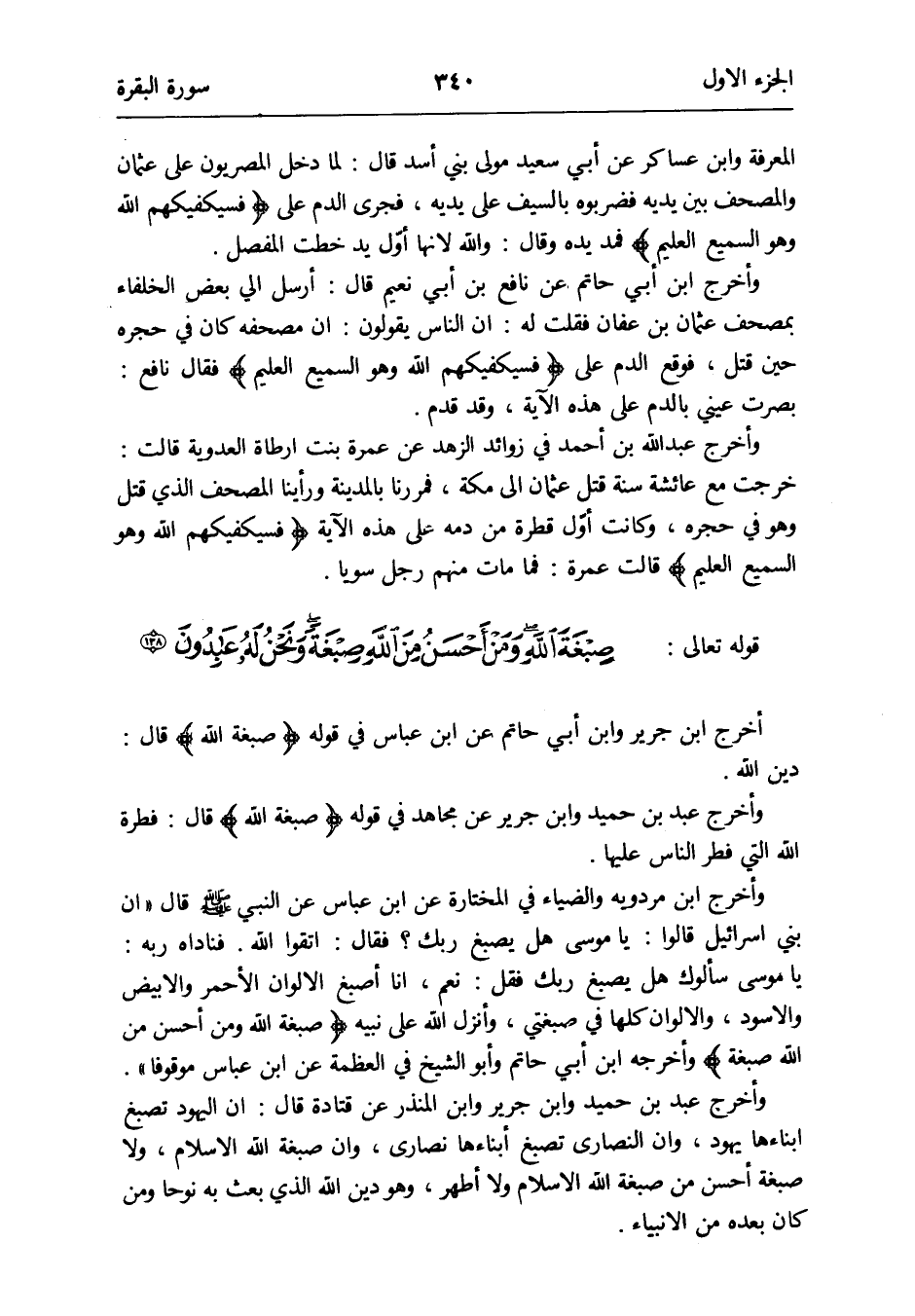 أخرج ابْن جرير وَابْن أبي حَاتِم عَن ابْن عَبَّاس فِي قَوْله {صبغة الله} قَالَ: دين الله