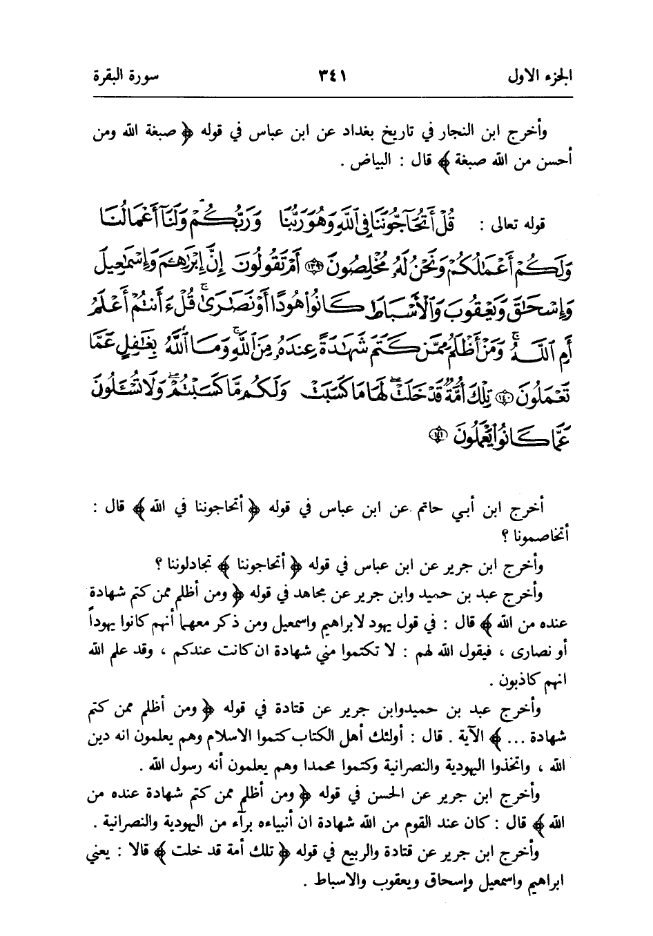 قَوْله تَعَالَى: قل أتحاجوننا فِي الله وَهُوَ رَبنَا وربكم وَلنَا أَعمالنَا وَلكم أَعمالكُم وَنحن لَهُ مخلصون أم تَقولُونَ إِن إِبْرَاهِيم واسماعيل وَإِسْحَق وَيَعْقُوب والأسباط كَانُوا هودا أَو نَصَارَى قل أأنتم أعلم أم الله وَمن أظلم مِمَّن كتم شَهَادَة عِنْده من الله وَمَا الله بغافل عَمَّا تَعْمَلُونَ تِلْكَ أمة قد خلت لَهَا مَا كسبت وَلكم مَا كسبتم وَلَا تسئلون عَمَّا كَانُوا يعْملُونَ