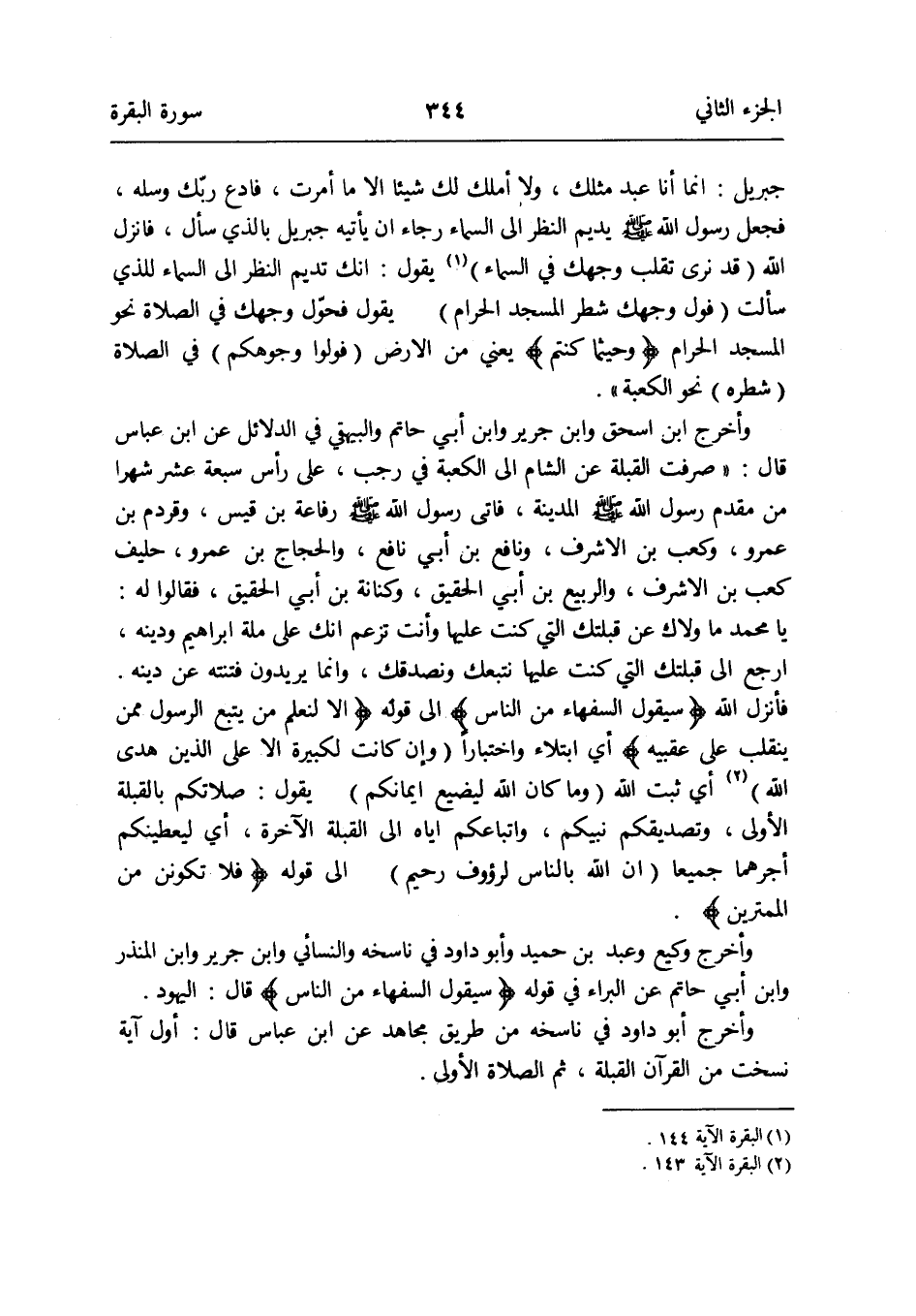 فَأنْزل الله {سَيَقُولُ السُّفَهَاء من النَّاس} إِلَى قَوْله {إِلَّا لنعلم من يتبع الرَّسُول مِمَّن يَنْقَلِب على عَقِبَيْهِ} أَي ابتلاء واختباراً (وَإِن كَانَت لكبيرة إِلَّا على الَّذين هدى الله) (الْبَقَرَة الْآيَة 143) أَي ثَبت الله (وَمَا كَانَ الله لِيُضيع إيمَانكُمْ) يَقُول: صَلَاتكُمْ بالقبلة الأولى وتصديقكم نَبِيكُم واتباعكم اياه إِلَى الْقبْلَة الْآخِرَة أَي ليعطينكم أجرهما جَمِيعًا (إِن الله بِالنَّاسِ لرؤوف رَحِيم) إِلَى قَوْله {فَلَا تكونن من الممترين}