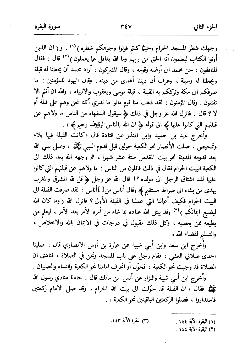 و (وَإِن الَّذين أُوتُوا الْكتاب ليعلمون أَنه الْحق من رَبهم وَمَا الله بغافل عَمَّا يعْملُونَ) (الْبَقَرَة الْآيَة 144) قَالَ: فَقَالَ المُنَافِقُونَ: حن مُحَمَّد إِلَى أرضه وَقَومه وَقَالَ الْمُشْركُونَ: أَرَادَ مُحَمَّد أَن يجعلنا لَهُ قبْلَة ويجعلنا لَهُ وَسِيلَة وَعرف أَن ديننَا أهْدى من دينه