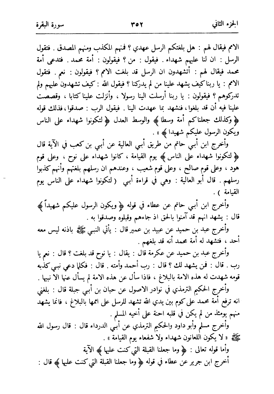 وَأخرج ابْن أبي حَاتِم من طَرِيق أبي الْعَالِيَة عَن أبي بن كَعْب فِي الْآيَة قَالَ {لِتَكُونُوا شُهَدَاء على النَّاس} يَوْم الْقِيَامَة كَانُوا شُهَدَاء على قوم نوح وعَلى قوم هود وعَلى قوم صَالح وعَلى قوم شُعَيْب وَعِنْدهم أَن رسلهم بلغتهم وَأَنَّهُمْ كذبُوا رسلهم