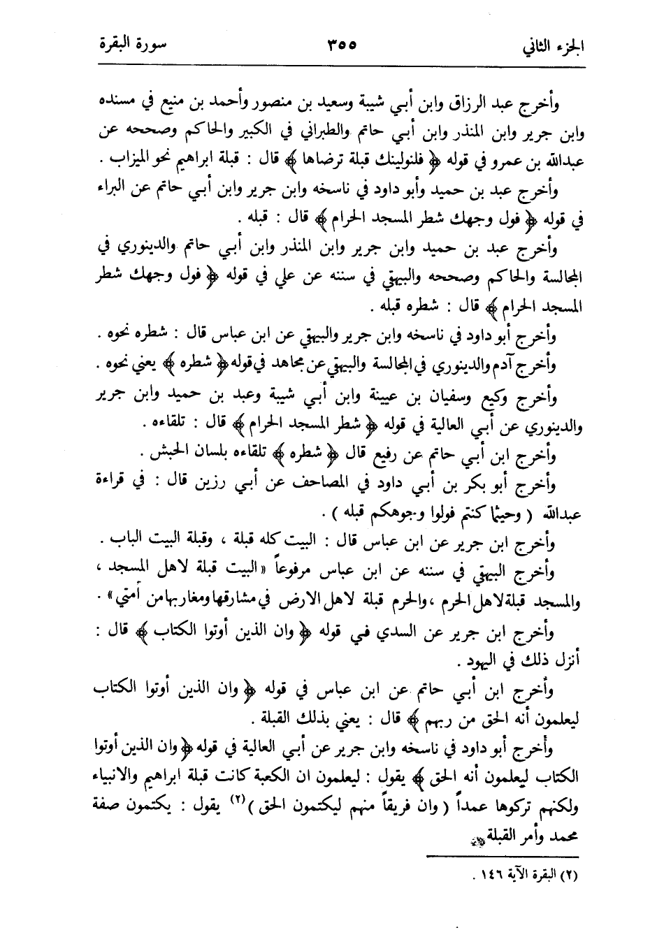 وَأخرج عبد بن حميد وَابْن جرير وَابْن أبي حَاتِم والدينوري فِي المجالسة وَالْحَاكِم وَصَححهُ وَالْبَيْهَقِيّ فِي سنَنه عَن عَليّ فِي قَوْله {فول وَجهك شطر الْمَسْجِد الْحَرَام} قَالَ: شطره قبله