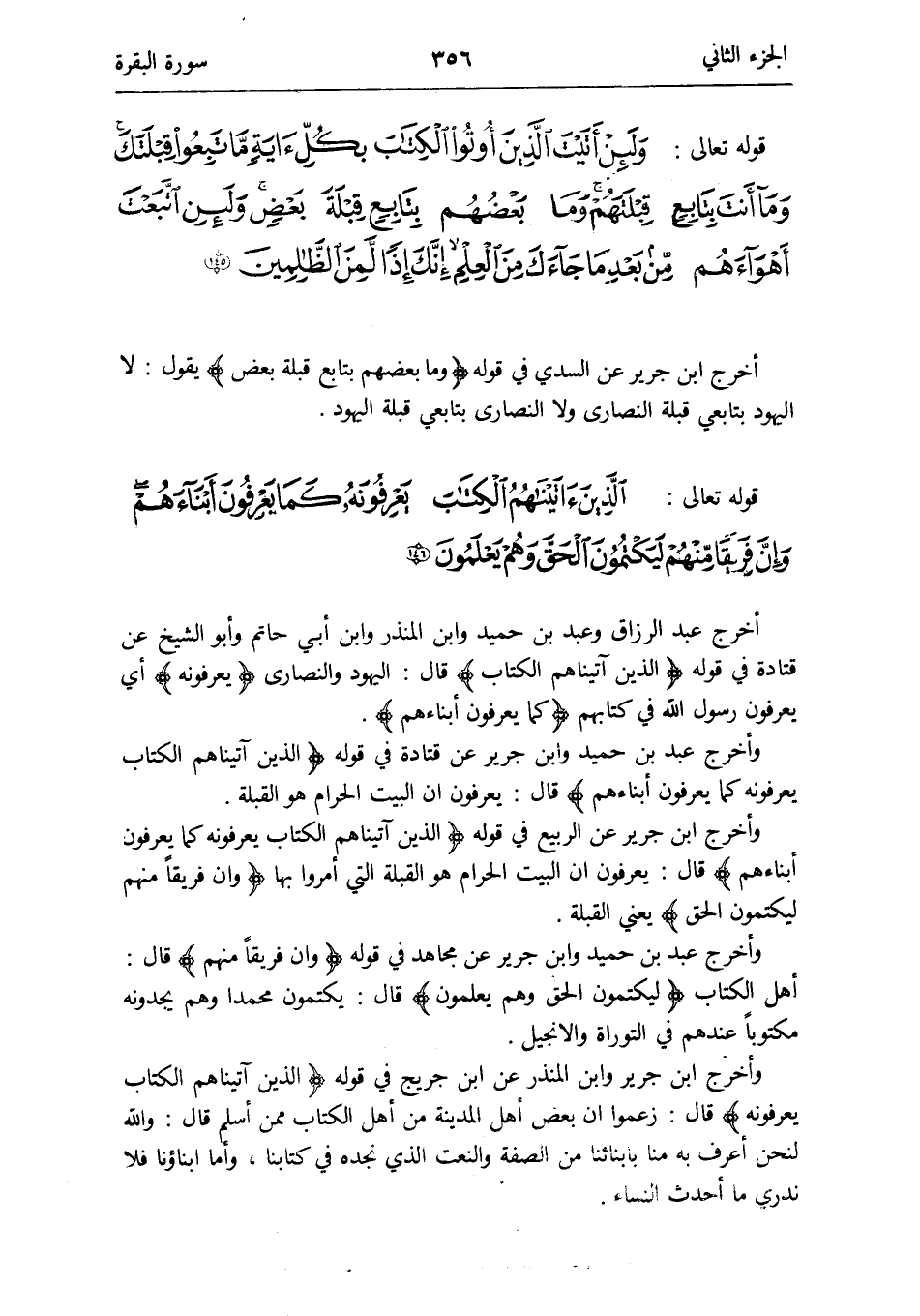 وَأخرج ابْن جرير عَن الرّبيع فِي قَوْله {الَّذين آتَيْنَاهُم الْكتاب يعرفونه كَمَا يعْرفُونَ أَبْنَاءَهُم} قَالَ: يعْرفُونَ أَن الْبَيْت الْحَرَام هُوَ الْقبْلَة الَّتِي أمروا بهَا {وَإِن فريقاً مِنْهُم ليكتمون الْحق} يَعْنِي الْقبْلَة