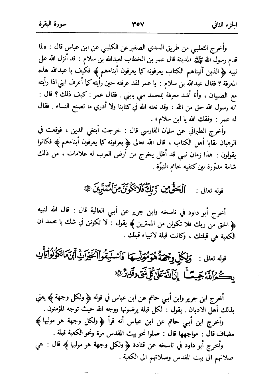 أخرج أَبُو دلود فِي ناسخه وَابْن جرير عَن أبي الْعَالِيَة قَالَ: قَالَ الله لنَبيه {الْحق من رَبك فَلَا تكونن من الممترين} يَقُول: لَا تكونن فِي شكّ يَا مُحَمَّد أَن الْكَعْبَة هِيَ قبلتك وَكَانَت قبْلَة لأنبياء قبلك