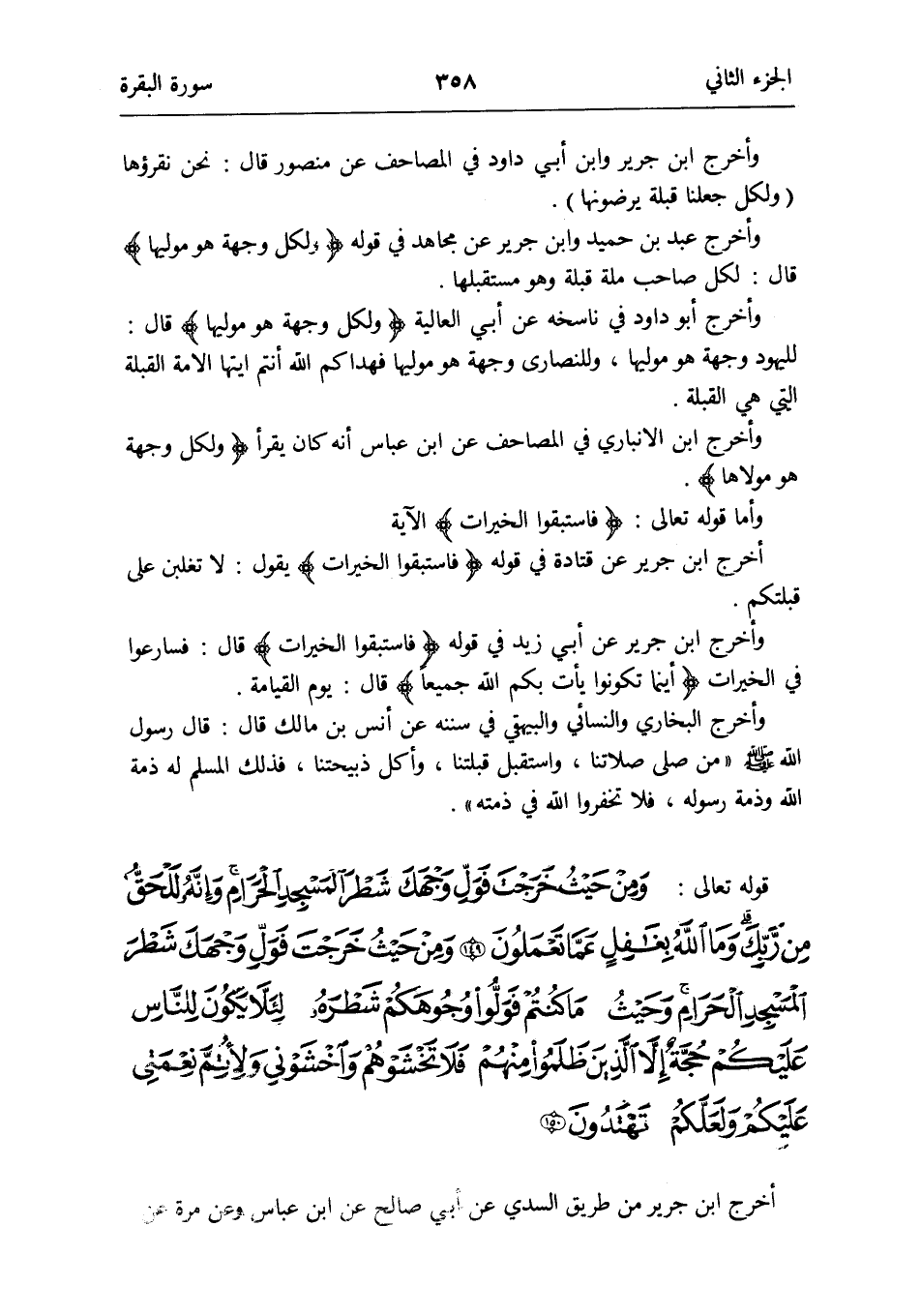 قَوْله تَعَالَى: وَمن حَيْثُ خرجت فول وَجهك شطر الْمَسْجِد الْحَرَام وَإنَّهُ للحق من رَبك وَمَا الله بغافل عَمَّا يعْملُونَ وَمن حَيْثُ خرجت فول وَجهك شطر الْمَسْجِد الْحَرَام وَحَيْثُ مَا كُنْتُم فَوَلوا وُجُوهكُم شطره لِئَلَّا يكون للنَّاس عَلَيْكُم حجَّة إِلَّا الَّذين ظلمُوا مِنْهُم فَلَا تخشوهم واخشوني ولأتم نعمتي عَلَيْكُم ولعلكم تهتدون
