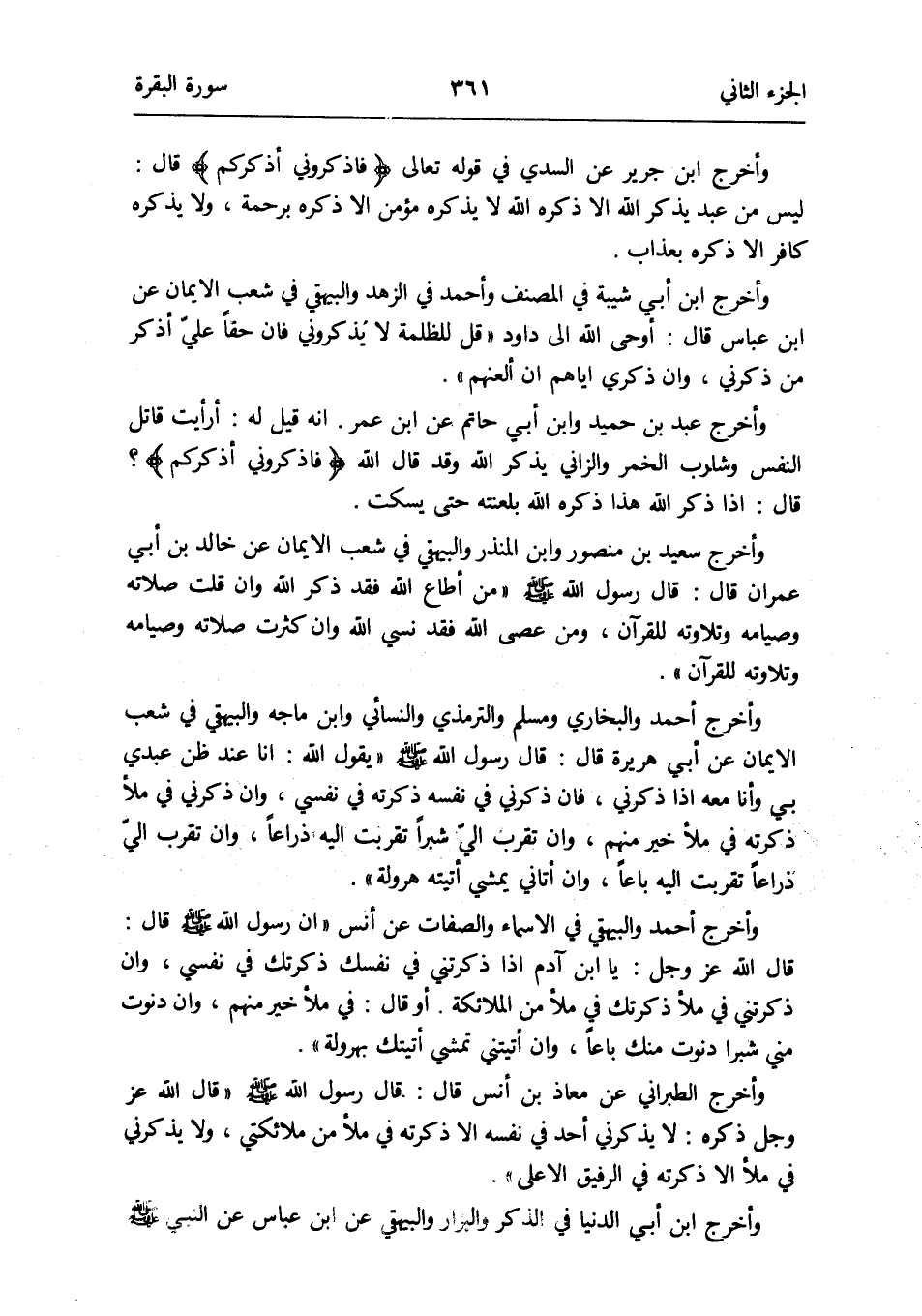 وَأخرج أَحْمد وَالْبُخَارِيّ وَمُسلم وَالتِّرْمِذِيّ وَالنَّسَائِيّ وَابْن ماجة وَالْبَيْهَقِيّ فِي شعب الإِيمان عَن أبي هُرَيْرَة قَالَ: قَالَ رَسُول الله صلى الله عَلَيْهِ وَسلم يَقُول الله: أَنا عِنْد ظن عَبدِي بِي وَأَنا مَعَه إِذا ذَكرنِي فَإِن ذَكرنِي فِي نَفسه ذكرته فِي نَفسِي وَإِن ذَكرنِي فِي مَلأ ذكرته فِي مَلأ خير مِنْهُم وَإِن تقرب إِلَيّ شبْرًا تقربت إِلَيْهِ ذِرَاعا وَإِن تقرب إليّ ذِرَاعا تقربت إِلَيْهِ باعاً وَإِن أَتَانِي يمشي أَتَيْته هرولة