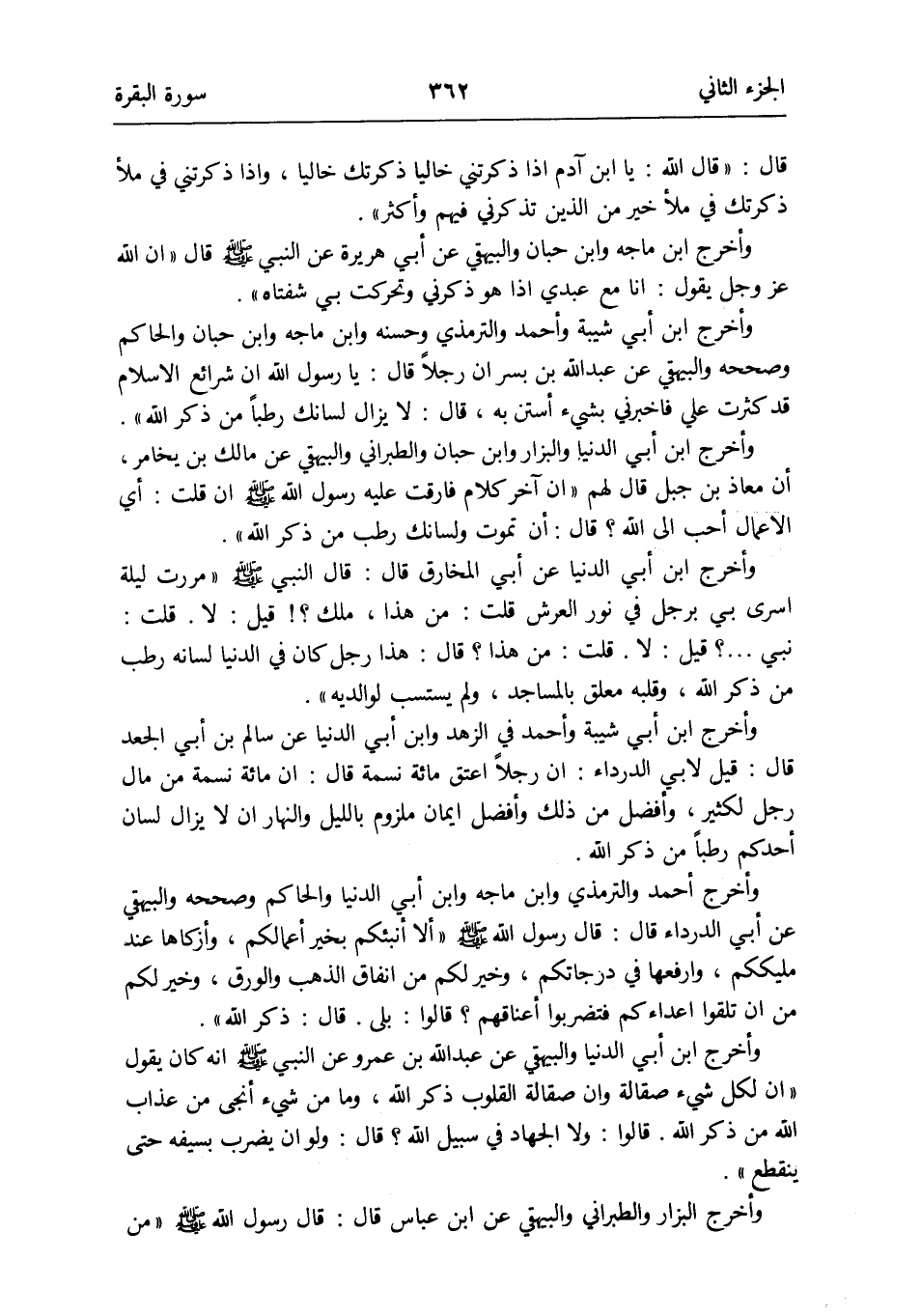 وَأخرج أَحْمد وَالتِّرْمِذِيّ وَابْن ماجة وَابْن أبي الدُّنْيَا وَالْحَاكِم وَصَححهُ وَالْبَيْهَقِيّ عَن أبي الدَّرْدَاء قَالَ: قَالَ رَسُول الله صلى الله عَلَيْهِ وَسلم أَلا أنبئكم بِخَير أَعمالكُم وأزكاها عِنْد مليككم وأرفعها فِي درجاتكم وَخير لكم من إِنْفَاق الذَّهَب وَالْوَرق وَخير لكم من أَن تلقوا اعداءكم فتضربوا أَعْنَاقهم قَالُوا: بلَى