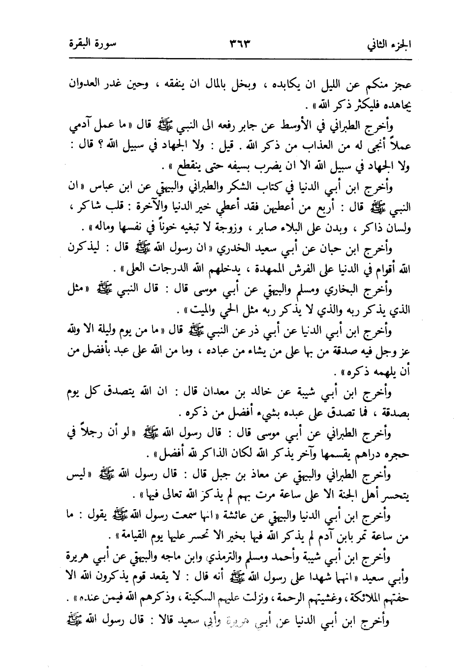 وَأخرج البُخَارِيّ وَمُسلم وَالْبَيْهَقِيّ عَن أبي مُوسَى قَالَ: قَالَ النَّبِي صلى الله عَلَيْهِ وَسلم مثل الَّذِي يذكر ربه وَالَّذِي لَا يذكر ربه مثل الْحَيّ وَالْمَيِّت