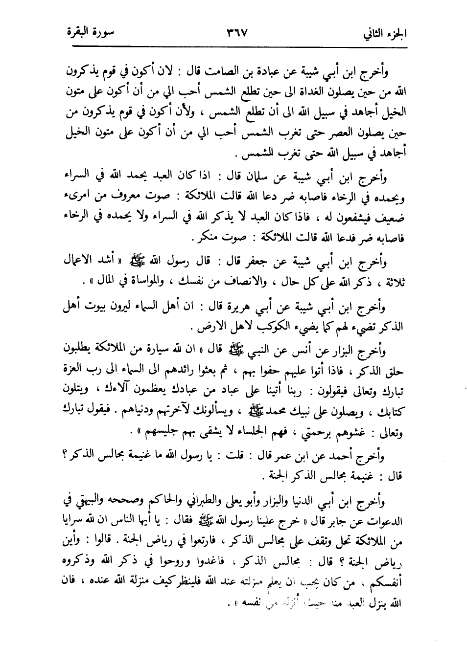 وَأخرج ابْن أبي شيبَة عَن عبَادَة بن الصَّامِت قَالَ: لِأَن أكون فِي قوم يذكرُونَ الله من حِين يصلونَ الْغَدَاة إِلَى حِين تطلع الشَّمْس أحب إِلَيّ من أَن أكون على متون الْخَيل أجاهد فِي سَبِيل الله إِلَى أَن تطلع الشَّمْس وَلِأَن أكون فِي قوم يذكرُونَ من حِين يصلونَ الْعَصْر حَتَّى تغرب الشَّمْس أحب إِلَيّ من أَن أكون على متون الْخَيل أجاهد فِي سَبِيل الله حَتَّى تغرب الشَّمْس