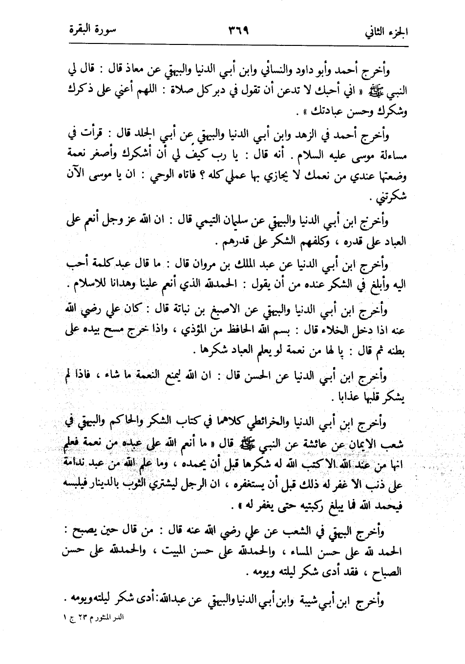 وَأخرج أَحْمد وَأَبُو دَاوُد وَالنَّسَائِيّ وَابْن أبي الدُّنْيَا وَالْبَيْهَقِيّ عَن معَاذ قَالَ: قَالَ لي النَّبِي صلى الله عَلَيْهِ وَسلم إِنِّي أحبك لَا تدعن أَن تَقول فِي دبر كل صَلَاة: اللَّهُمَّ أَعنِي على شكرك وشكرك وَحسن عبادتك