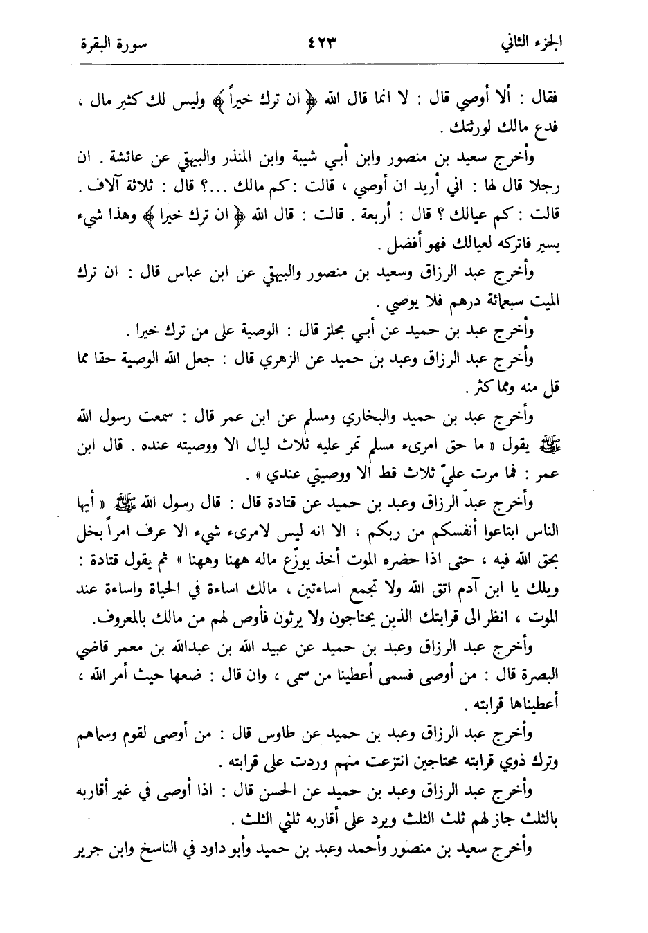 وَأخرج عبد بن حميد وَالْبُخَارِيّ وَمُسلم عَن ابْن عمر قَالَ: سَمِعت رَسُول الله صلى الله عَلَيْهِ وَسلم يَقُول مَا حق امرىء مُسلم تمر عَلَيْهِ ثَلَاث لَيَال إِلَّا وَصيته عِنْده