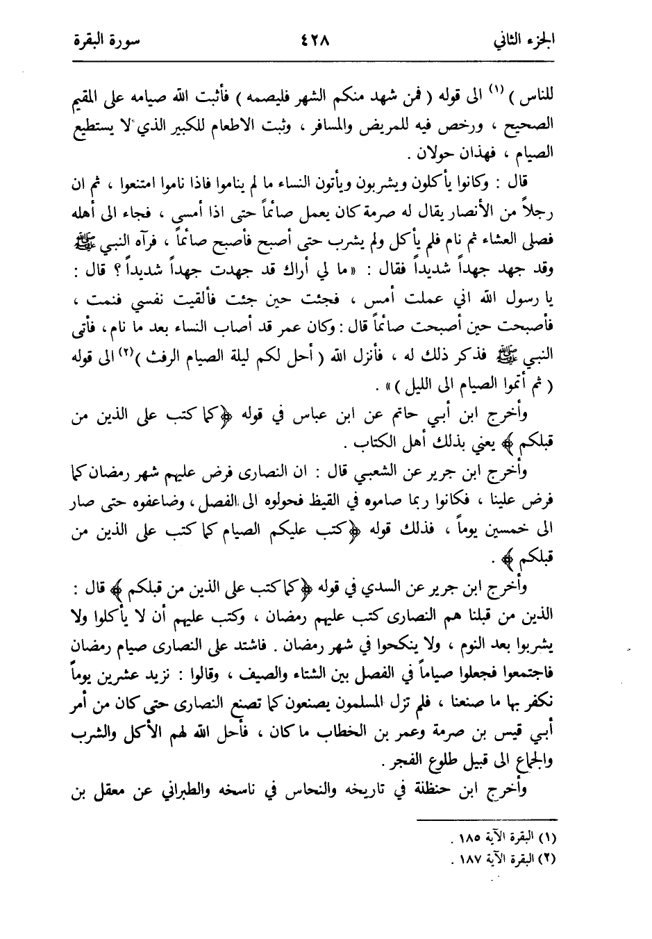 قَالَ: وَكَانُوا يَأْكُلُون وَيَشْرَبُونَ ويأتون النِّسَاء مَا لم يَنَامُوا فَإِذا نَامُوا امْتَنعُوا ثمَّ أَن رجلا من الْأَنْصَار يُقَال لَهُ صرمة كَانَ يعْمل صَائِما حَتَّى إِذا أَمْسَى فجَاء إِلَى أَهله فصلَّى الْعشَاء ثمَّ نَام فَلم يَأْكُل وَلم يشرب حَتَّى أصبح فَأصْبح صَائِما فَرَآهُ النَّبِي صلى الله عَلَيْهِ وَسلم وَقد جهد جهداً شَدِيدا فَقَالَ: مَا لي أَرَاك قد جهدت جهداً شَدِيدا قَالَ: يَا رَسُول الله عملت أمس فَجئْت حِين جِئْت فألقيت نَفسِي فَنمت فَأَصْبَحت حِين أَصبَحت صَائِما قَالَ: وَكَانَ عمر قد أصَاب النِّسَاء بعد مَا نَام فَأتى النَّبِي صلى الله عَلَيْهِ وَسلم فَذكر ذَلِك لَهُ فَأنْزل الله (أحل لكم لَيْلَة الصّيام الرَّفَث) (الْبَقَرَة الْآيَة 187) إِلَى قَوْله (ثمَّ أَتموا الصّيام إِلَى اللَّيْل)