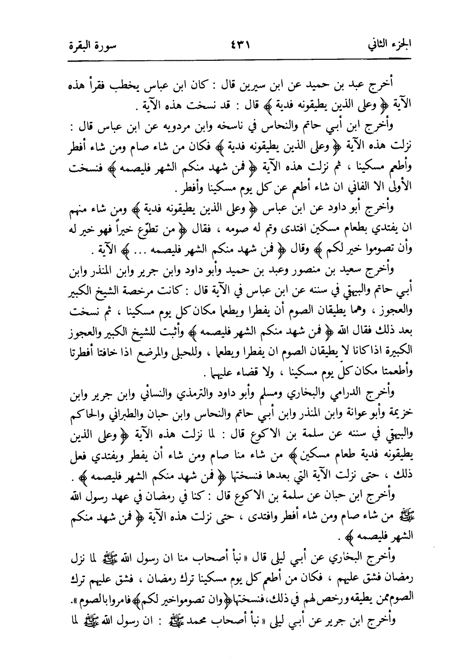 وَأخرج الدَّارمِيّ وَالْبُخَارِيّ وَمُسلم وَأَبُو دَاوُد وَالتِّرْمِذِيّ وَالنَّسَائِيّ وَابْن جرير وَابْن خُزَيْمَة وَأَبُو عوَانَة وَابْن الْمُنْذر وَابْن أبي حَاتِم والنحاس وَابْن حبَان وَالطَّبَرَانِيّ وَالْحَاكِم وَالْبَيْهَقِيّ فِي سنَنه عَن سَلمَة بن الْأَكْوَع قَالَ: لما نزلت هَذِه الْآيَة {وعَلى الَّذين يطيقُونَهُ فديَة} من شَاءَ منا صَامَ وَمن شَاءَ أَن يفْطر ويفتدي فعل ذَلِك حَتَّى نزلت الْآيَة الَّتِي بعْدهَا فنسختها {فَمن شهد مِنْكُم الشَّهْر فليصمه}