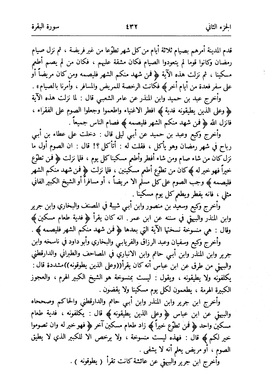 وَأخرج وَكِيع وسُفْيَان وَعبد الرَّزَّاق وَالْفِرْيَابِي وَالْبُخَارِيّ وَأَبُو دَاوُد فِي ناسخه وَابْن جرير وَابْن الْمُنْذر وَابْن أبي حَاتِم وَابْن الْأَنْبَارِي فِي الْمَصَاحِف وَالطَّبَرَانِيّ وَالدَّارَقُطْنِيّ وَالْبَيْهَقِيّ من طرق عَن ابْن عَبَّاس أَنه كَانَ يقْرَأ ((وعَلى الَّذين يطوقونه)) مُشَدّدَة قَالَ: يكلفونه وَلَا يطيقُونَهُ وَيَقُول: لَيست بمنسوخة هُوَ الشَّيْخ الْكَبِير الْهَرم والعجوز الْكَبِيرَة الهرمة يطْعمُون لكل يَوْم مِسْكينا وَلَا يقضون