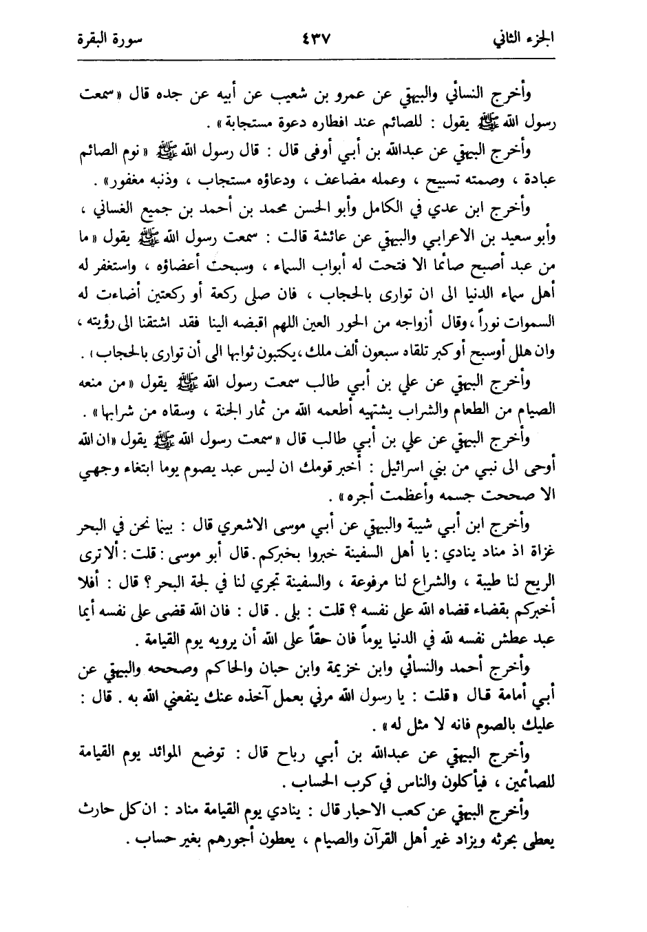 وَأخرج الْبَيْهَقِيّ عَن عبد الله بن أبي أوفى قَالَ: قَالَ رَسُول الله صلى الله عَلَيْهِ وَسلم نوم الصَّائِم عبَادَة وصمته تَسْبِيح وَعَمله مضاعف ودعاؤه مستجاب وذنبه مغْفُور