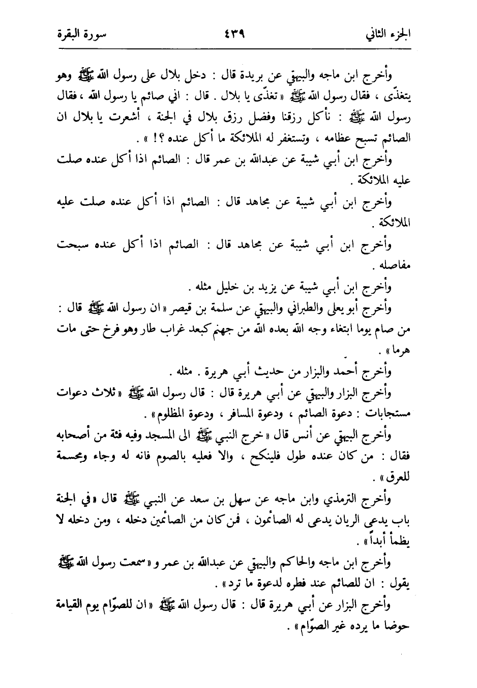 وأخرح الْبَزَّار عَن أبي هُرَيْرَة قَالَ: قَالَ رَسُول الله صلى الله عَلَيْهِ وَسلم إِن للصَّوْم يَوْم القايمة حوضاً مَا يردهُ غير الصوّام