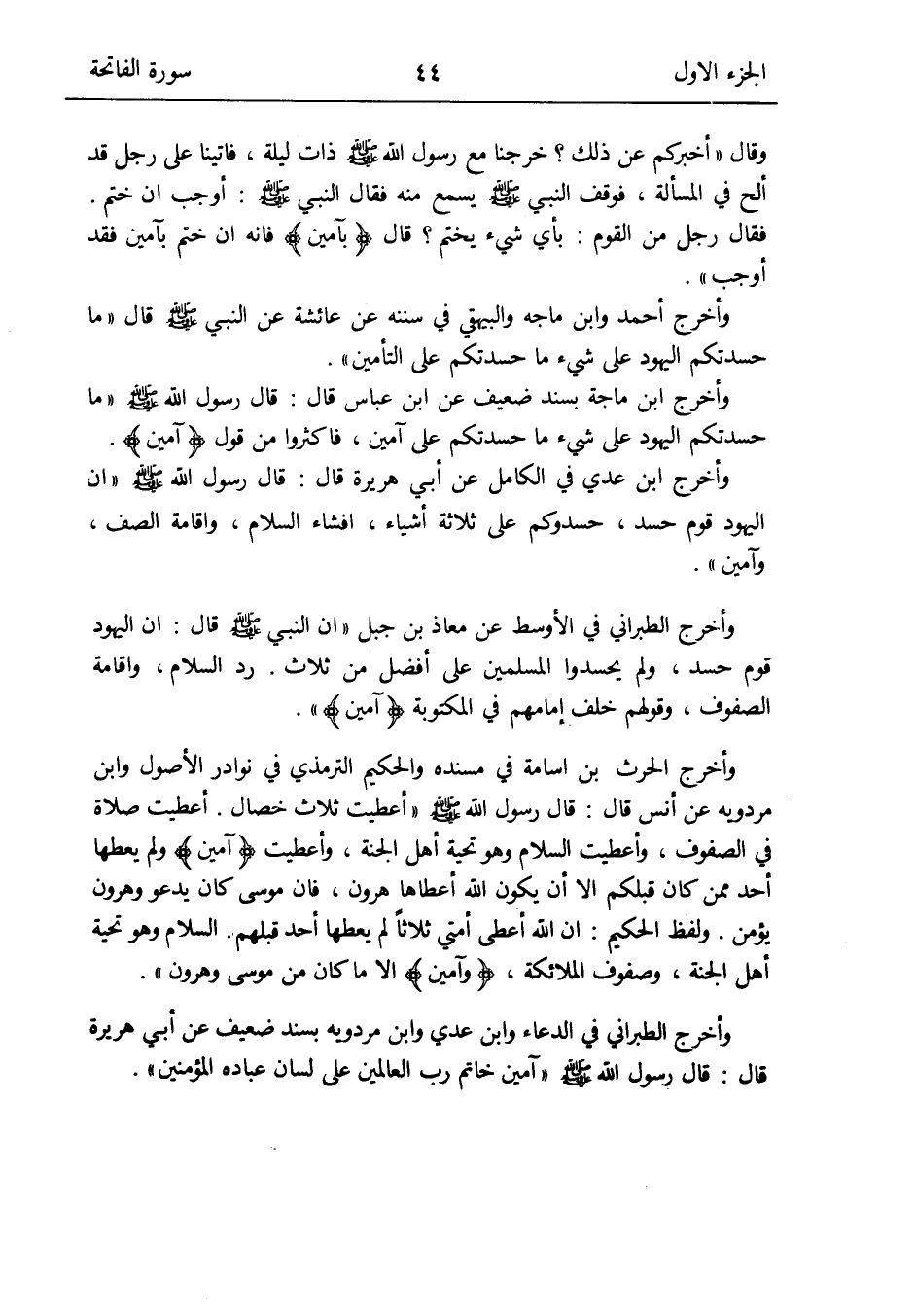 وَأخرج ابْن عدي فِي الْكَامِل عَن أبي هُرَيْرَة قَالَ: قَالَ رَسُول الله صلى الله عَلَيْهِ وَسلم إِن الْيَهُود قوم حسد حسدوكم على ثَلَاثَة أَشْيَاء إفشاء السَّلَام واقامة الصَّفّ وآمين